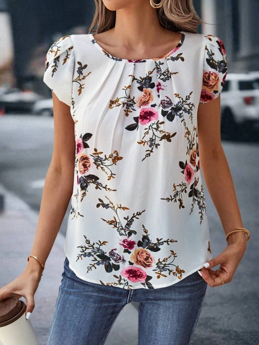 Kadın Kısa Kollu Bisiklet Yaka çiçek Baskılı Süprem Bluz