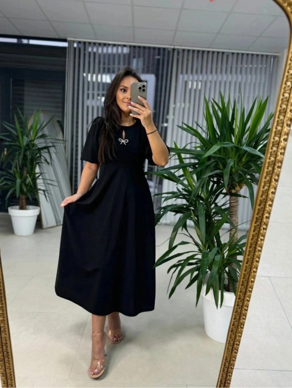 Kadın Kısa Kollu Bisiklet Yaka Fiyonk Broşlu Midi Janjan Krep Elbise