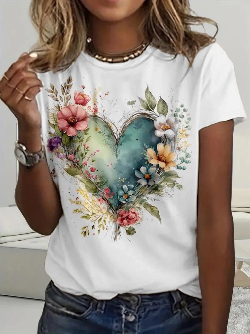 Kadın Kısa Kollu Bisiklet Yaka Kalp Desenli Süprem Bluz