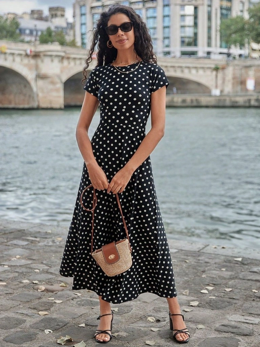 Kadın Kısa Kollu Bisiklet Yaka Puantiyeli Maksi örme Krep Elbise