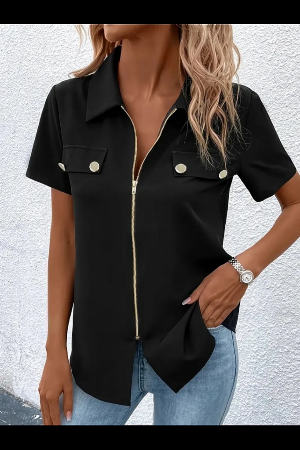 Kadın Kısa Kollu Ceket Yaka önü Fermuarlı Cep Detay Kısa Kol Ithal Krep Bluz