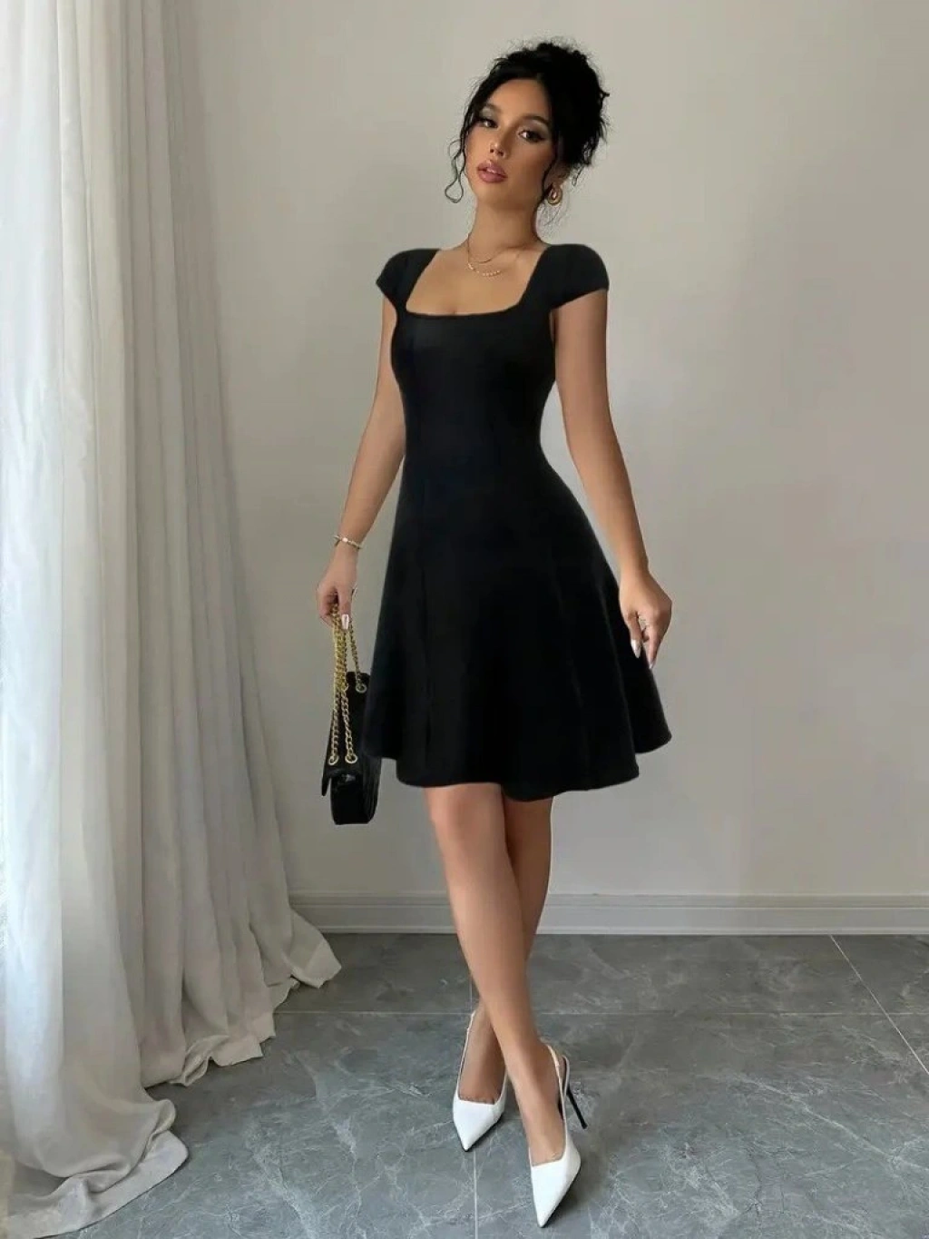 Kadın Kısa Kollu Geometrik Yakalı Janjan Krep Elbise