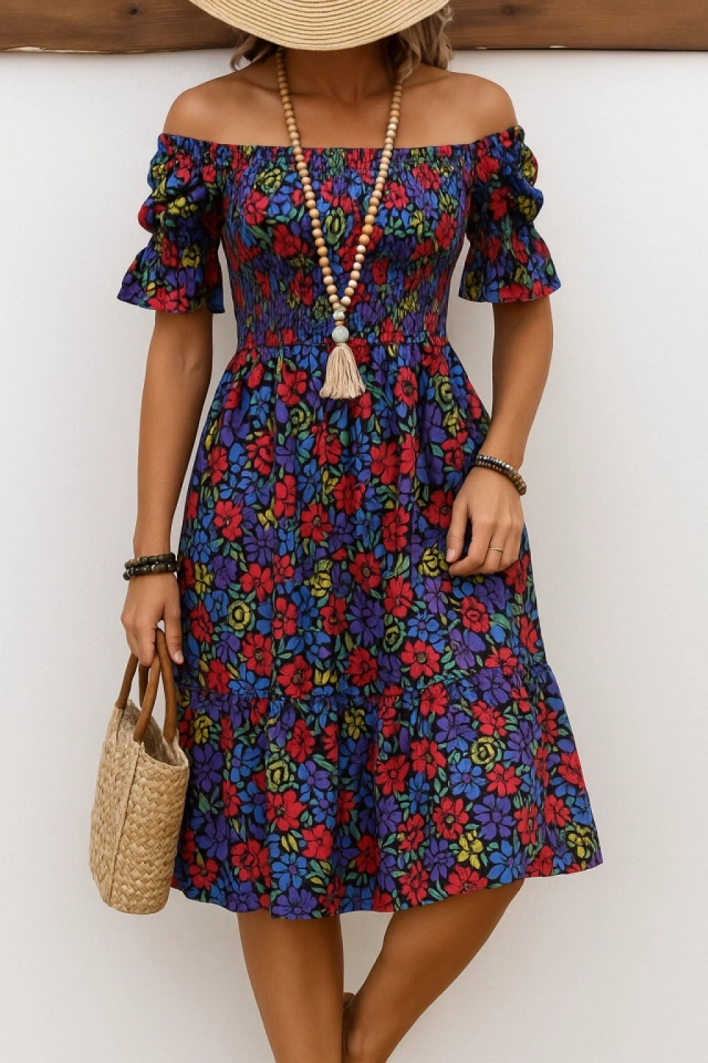 Kadın Kısa Kollu Kare Yakalı Beli Lastikli çiçek Desenli Mini Süprem Elbise