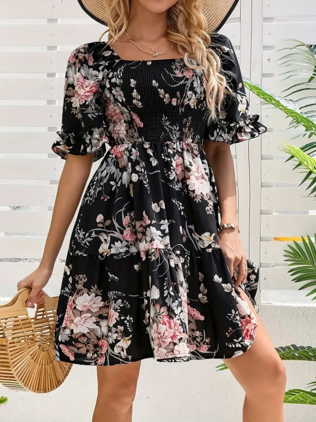 Kadın Kısa Kollu Kare Yakalı Beli Lastikli Kısa Süprem Elbise