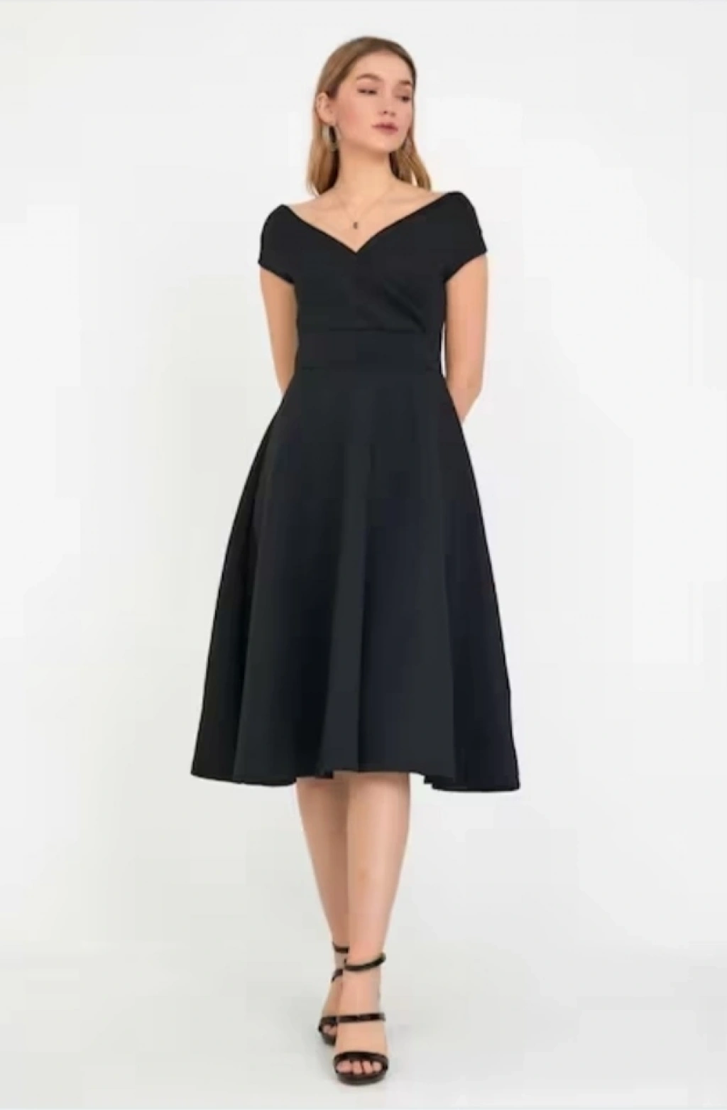 Kadın Kısa Kollu Kruvaze Yaka Eteği Volanlı Krep Elbise