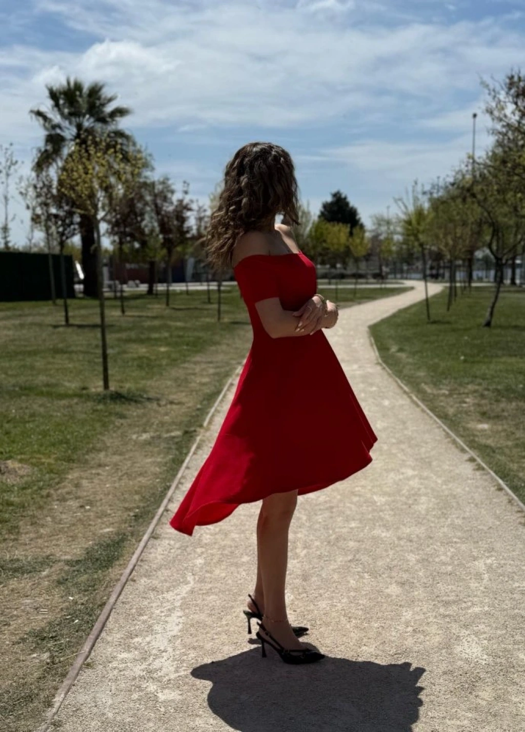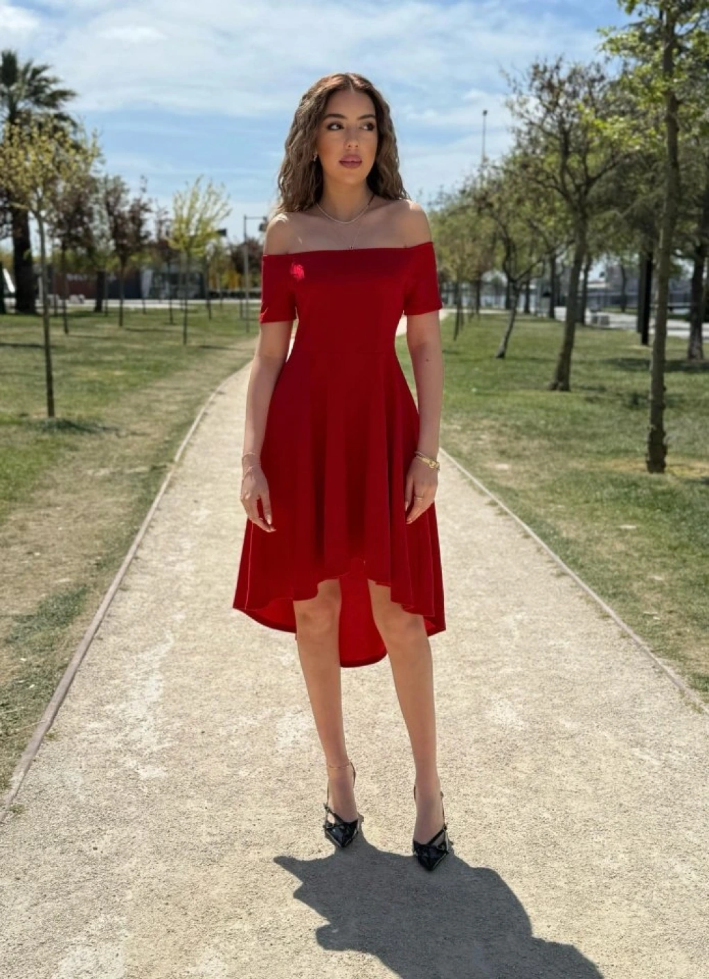 Kadın Kısa Kollu Madonna Yaka önü Kısa Arkası Uzun Ithal Krep Elbise