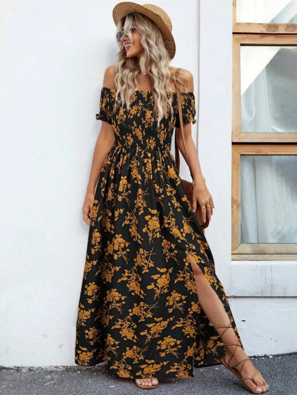 Kadın Kısa Kollu Madonna Yaka Yırtmaçlı çiçek Desenli Süprem Elbise