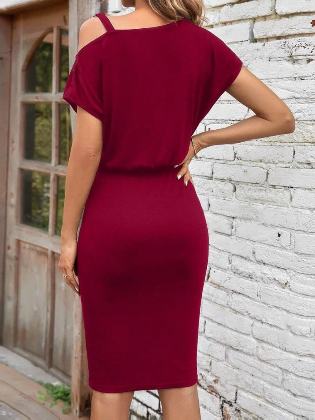 Kadın Kısa Kollu Tek Omuz Askı Ve Aksesuar Detay Beli Lastikli Krep Elbise