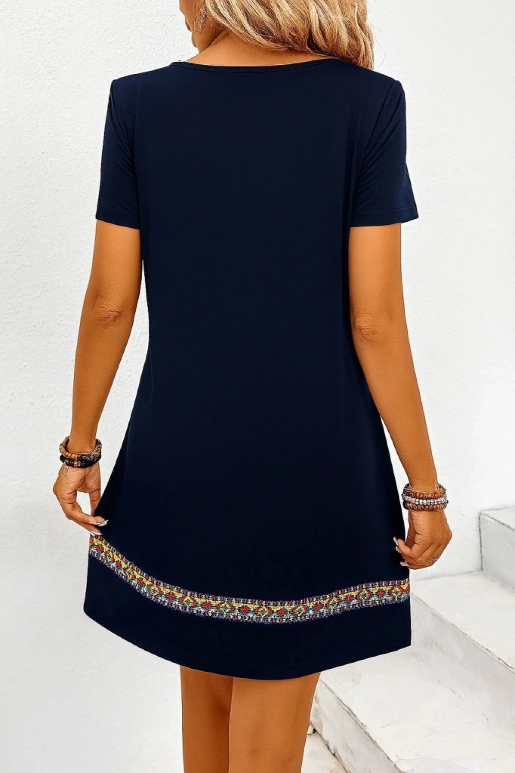 Kadın Kısa Kollu V Yakalı Etnik Desen şerit Detaylı Viskon Elbise