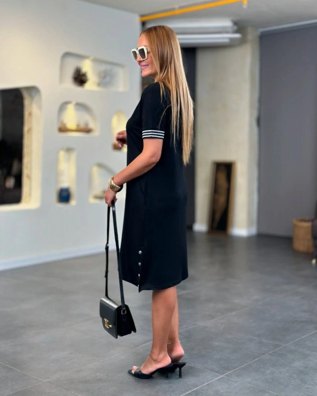 Kadın Kısa Kollu V Yakalı Yanlardan Yırtmaç Ve Düğmeli Viskon Iki Iplik Elbise