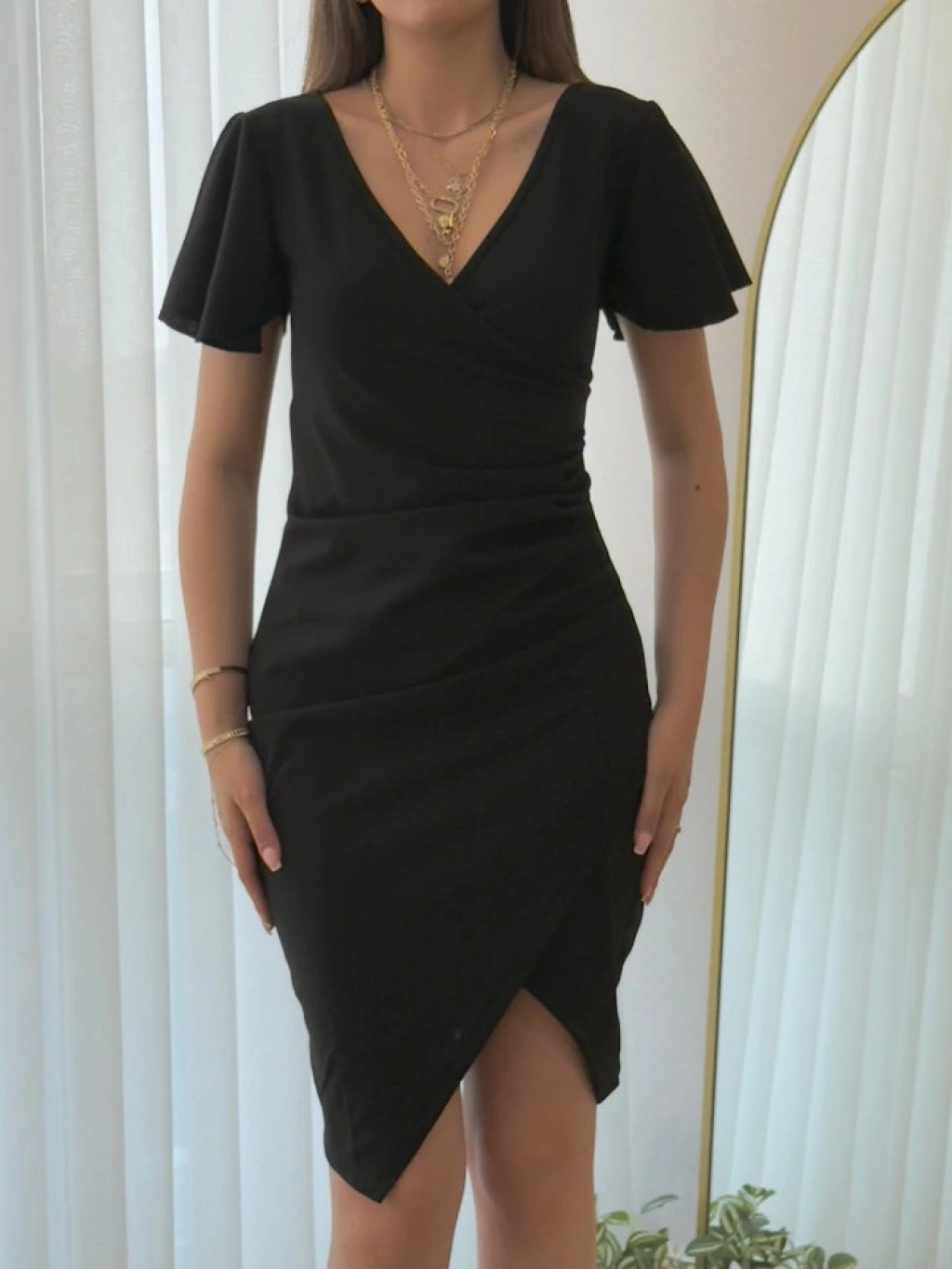 Kadın Kısa Kollu Volanlı Kruvaze Yaka Yanlardan Büzgülü Ithal Krep Elbise