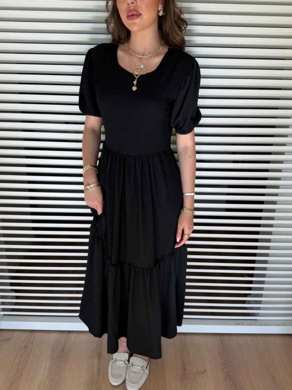Kadın Kısa Kollu Yakası Açık Katlı Bürümcük Balon Elbise