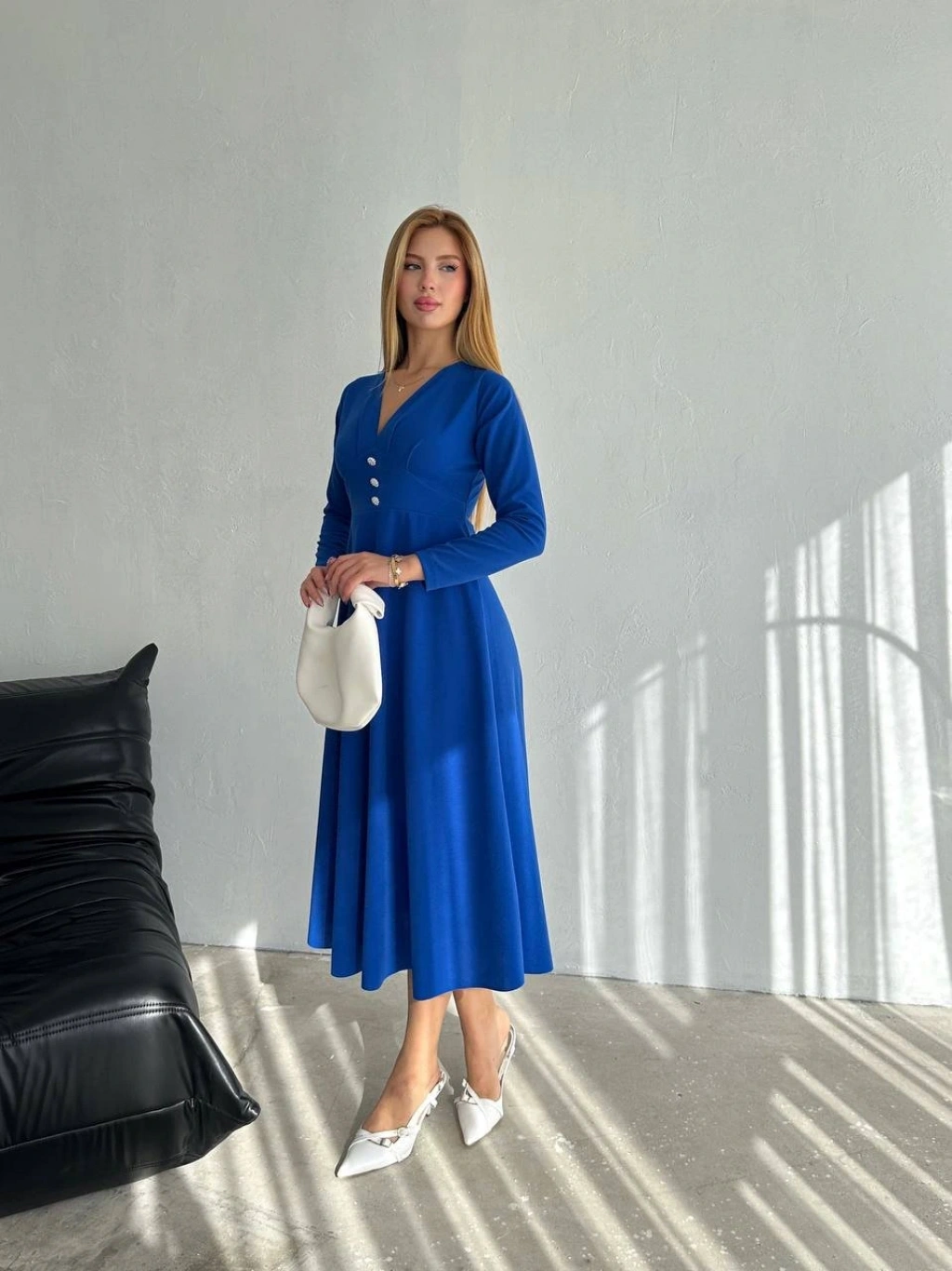 Kadın Krep Kumaş Düğme Detaylı V Yaka Uzun Kollu Midi Boy Elbise