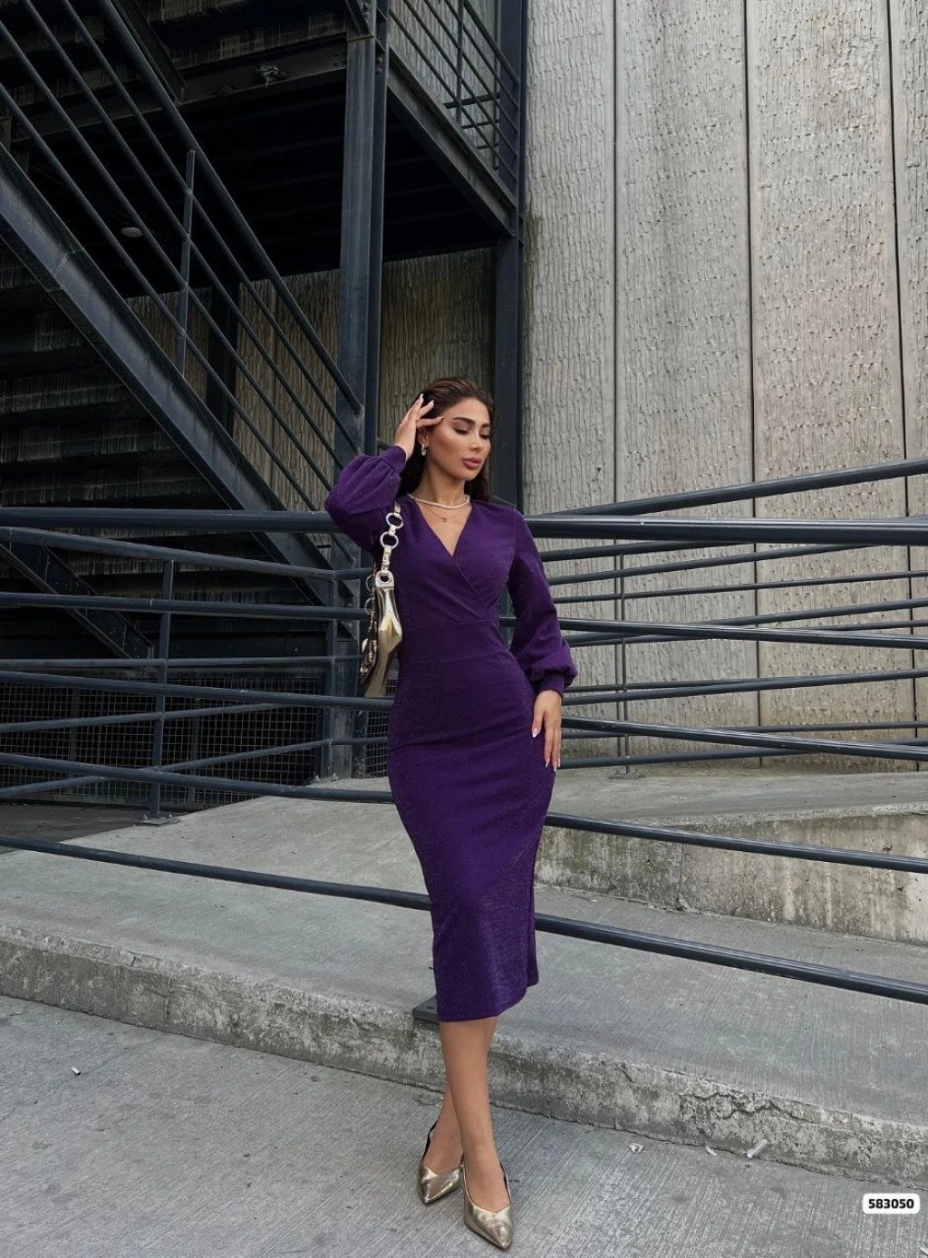 Kadın Kruvaze Yaka Balon Kol Simli Krep Kumaş Midi Boy Elbise