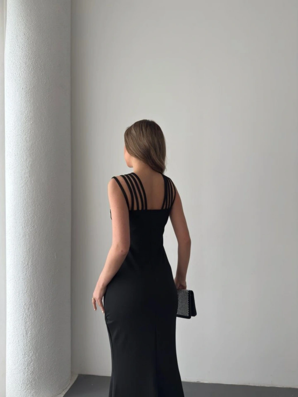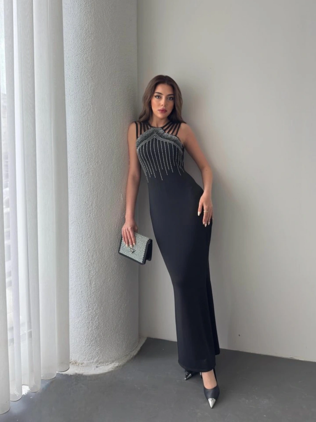 Kadın Omuz çoklu Askılı önü Taş Işlemeli Balık Kesim Janjan Krep Maxi Boy Elbise