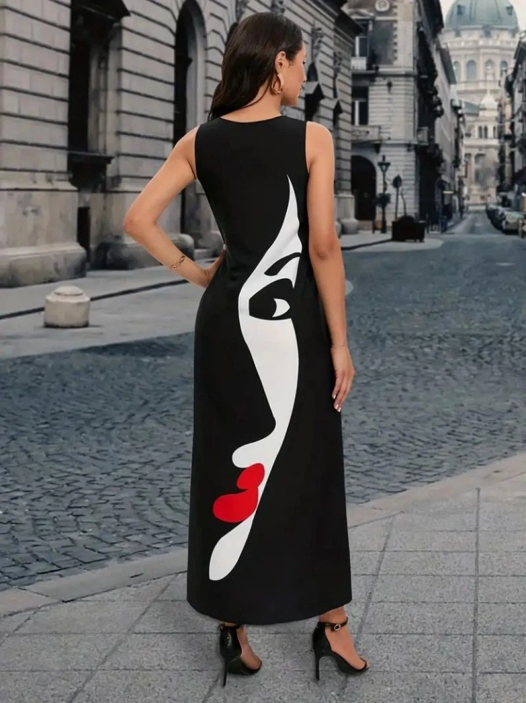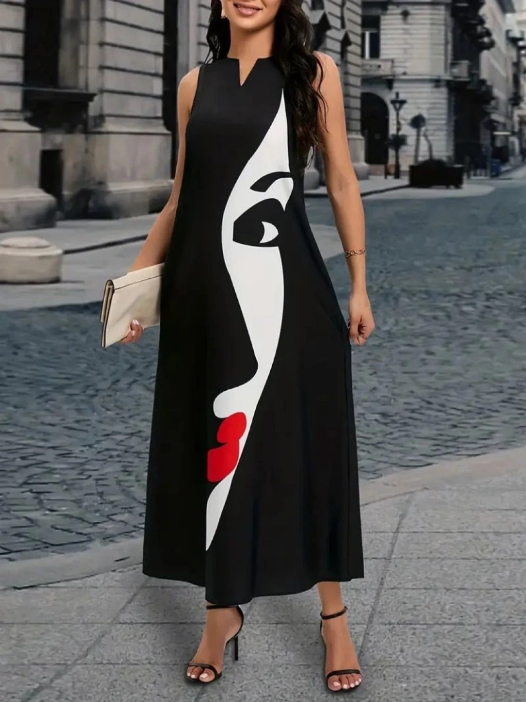 Kadın Sıfır Kol V Yakalı Kadın Yüz Desenli Süprem Elbise