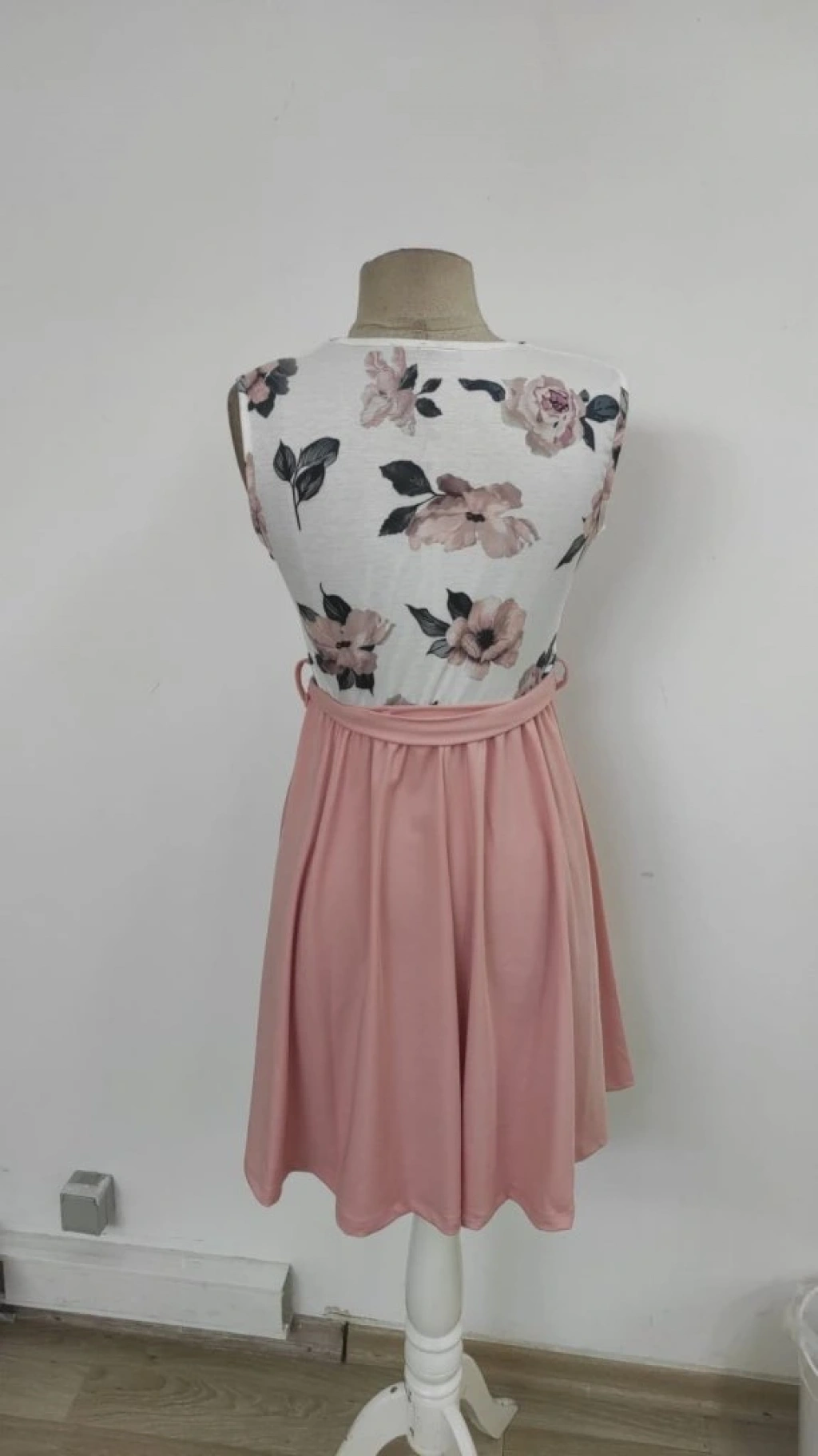 Kadın Sıfır Kollu V Yakalı çiçek Baskılı Beli Kuşaklı Dalgıç Elbise