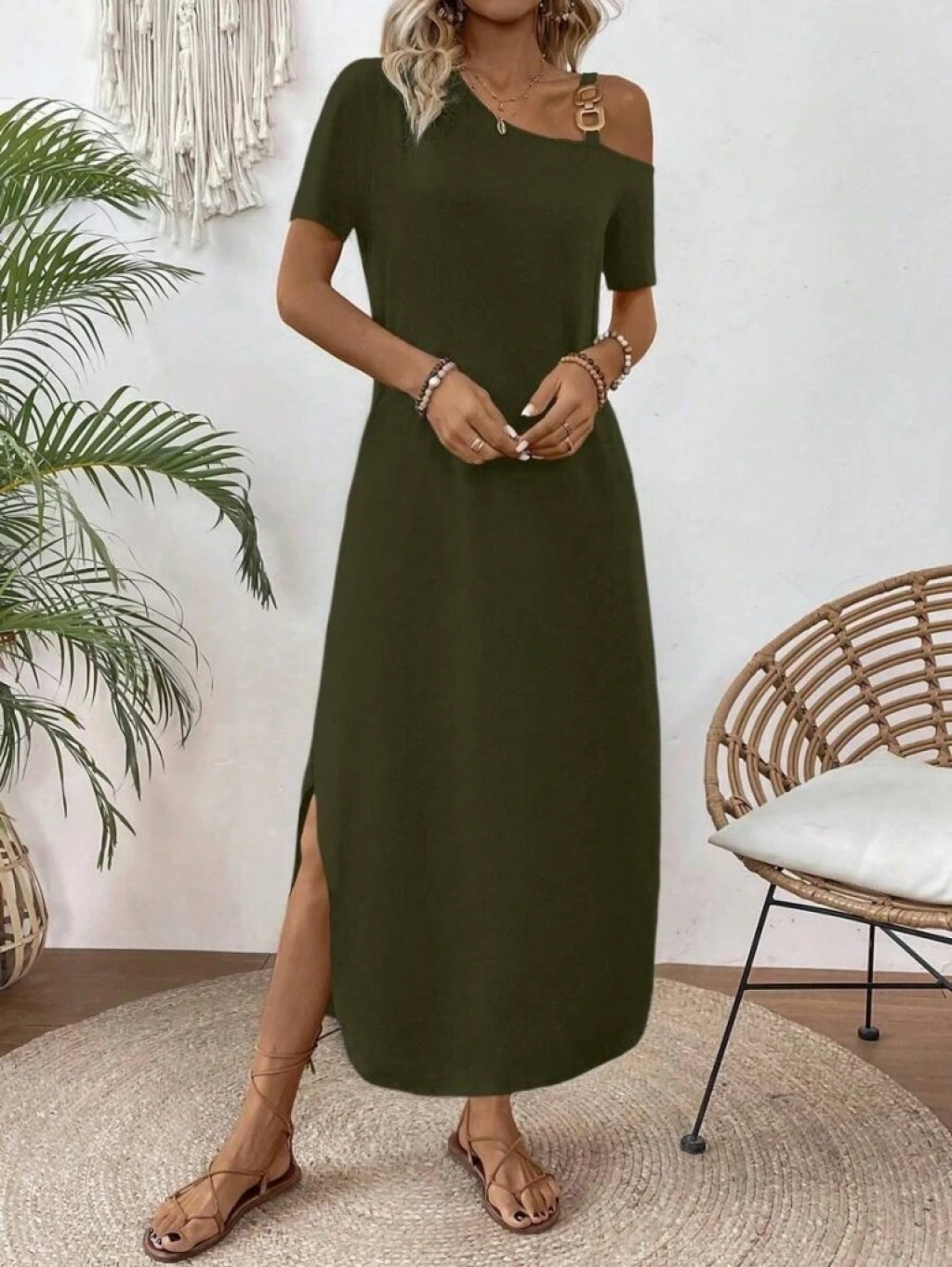 Kadın Tek Omuzdan Açık Toka Detaylı Yandan Yırtmaçlı Maksi Boy Viskon Elbise