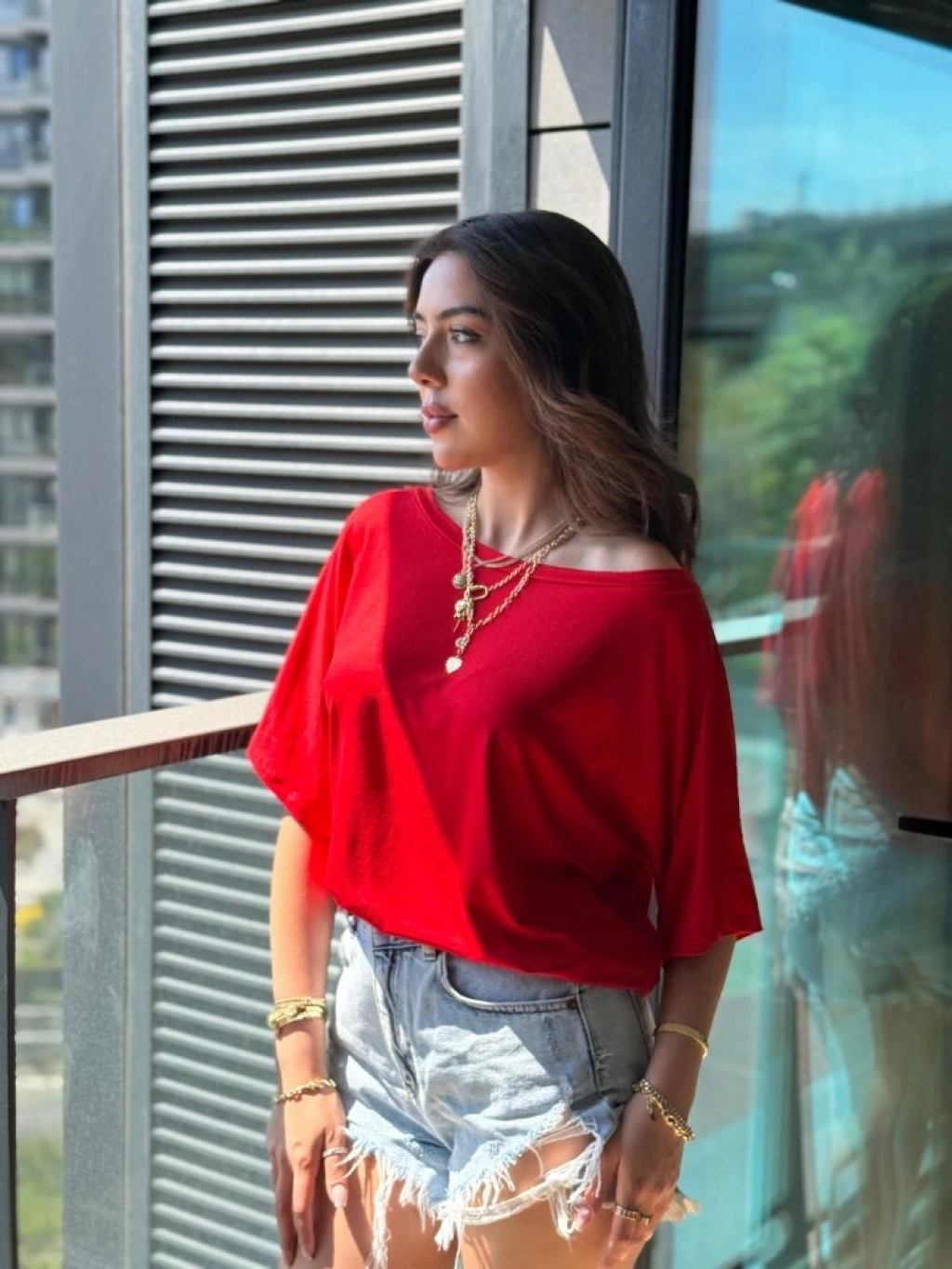 Kadın Tek Omuzu Açık Kısa Kollu Salaş Viskon Bluz