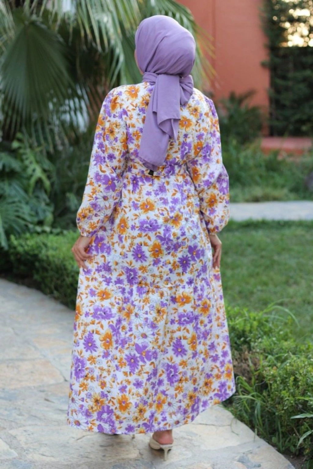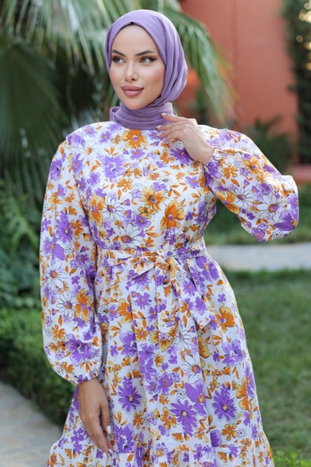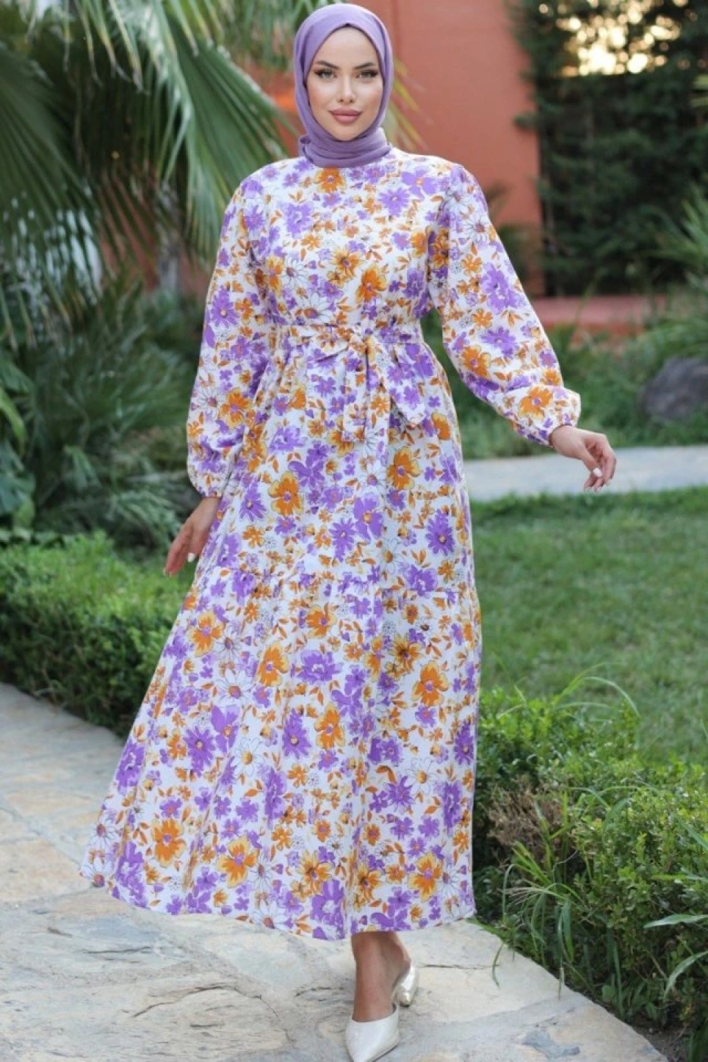 Kadın Uzun Çiçek Yaprak Desenli Belden Bağlamalı Elbise