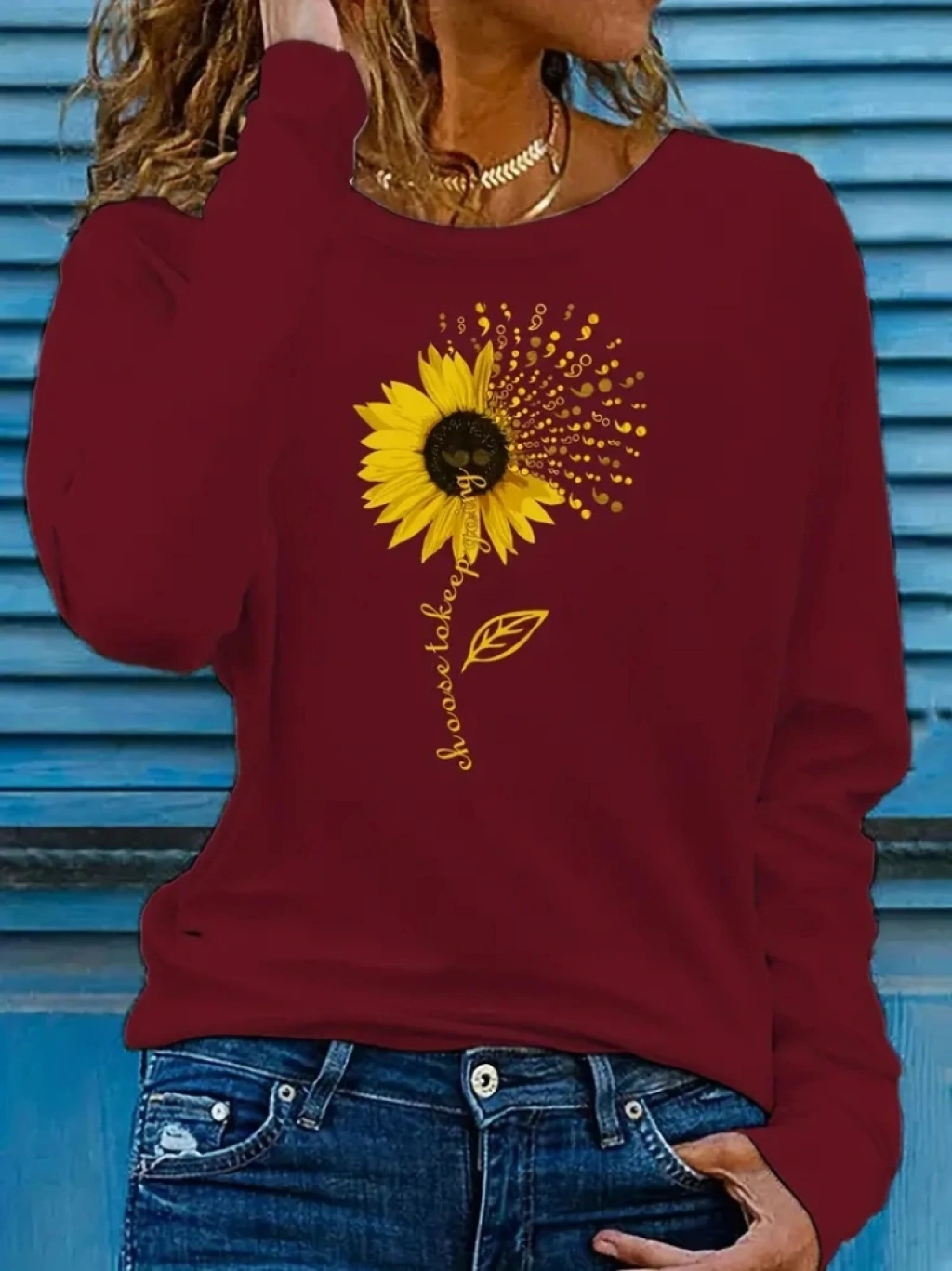 Kadın Uzun Kollu Bisiklet Yaka Ayçiçeği Desenli Viskon Bluz