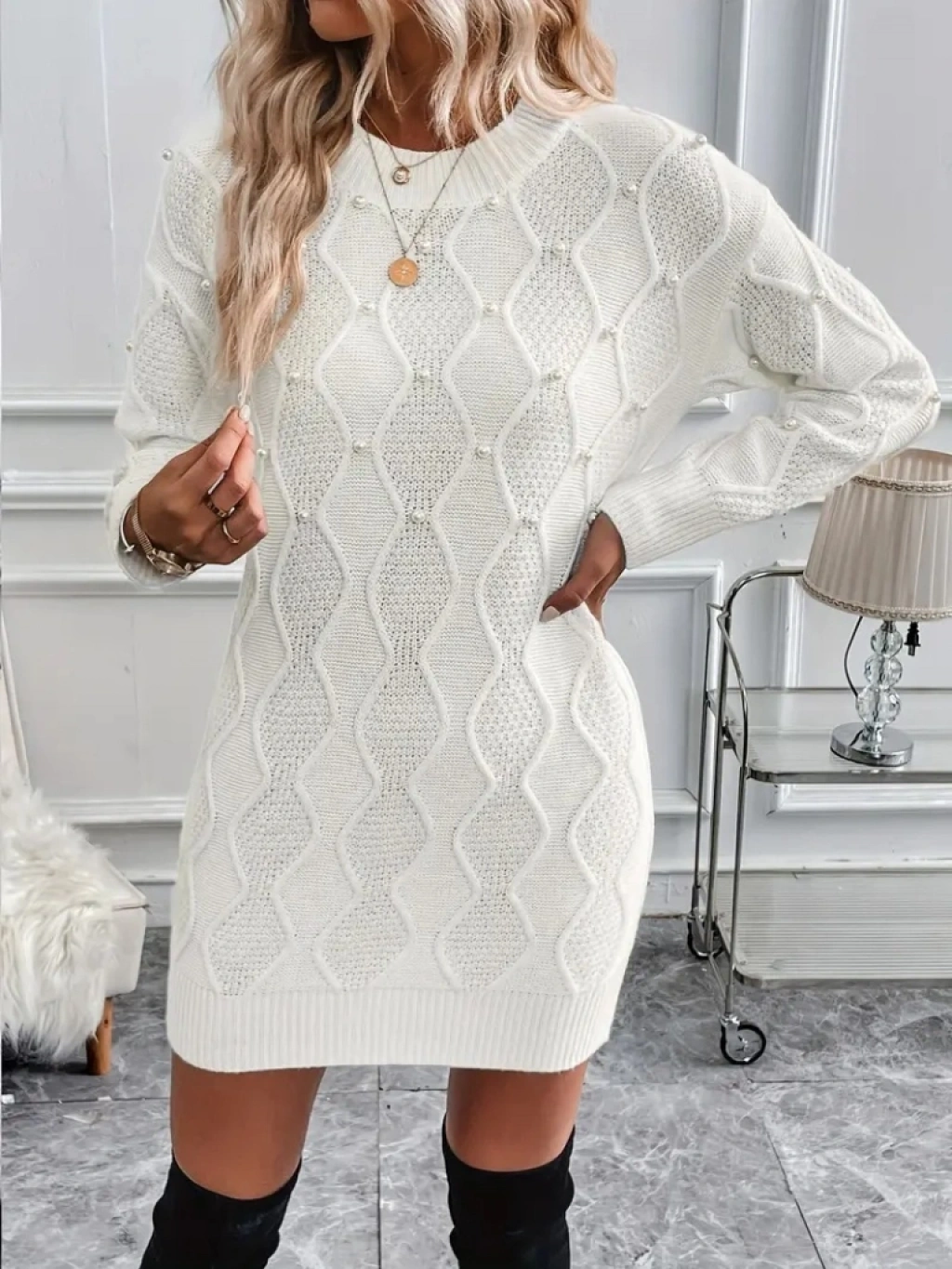 Kadın Uzun Kollu Bisiklet Yaka Desenli Triko Elbise