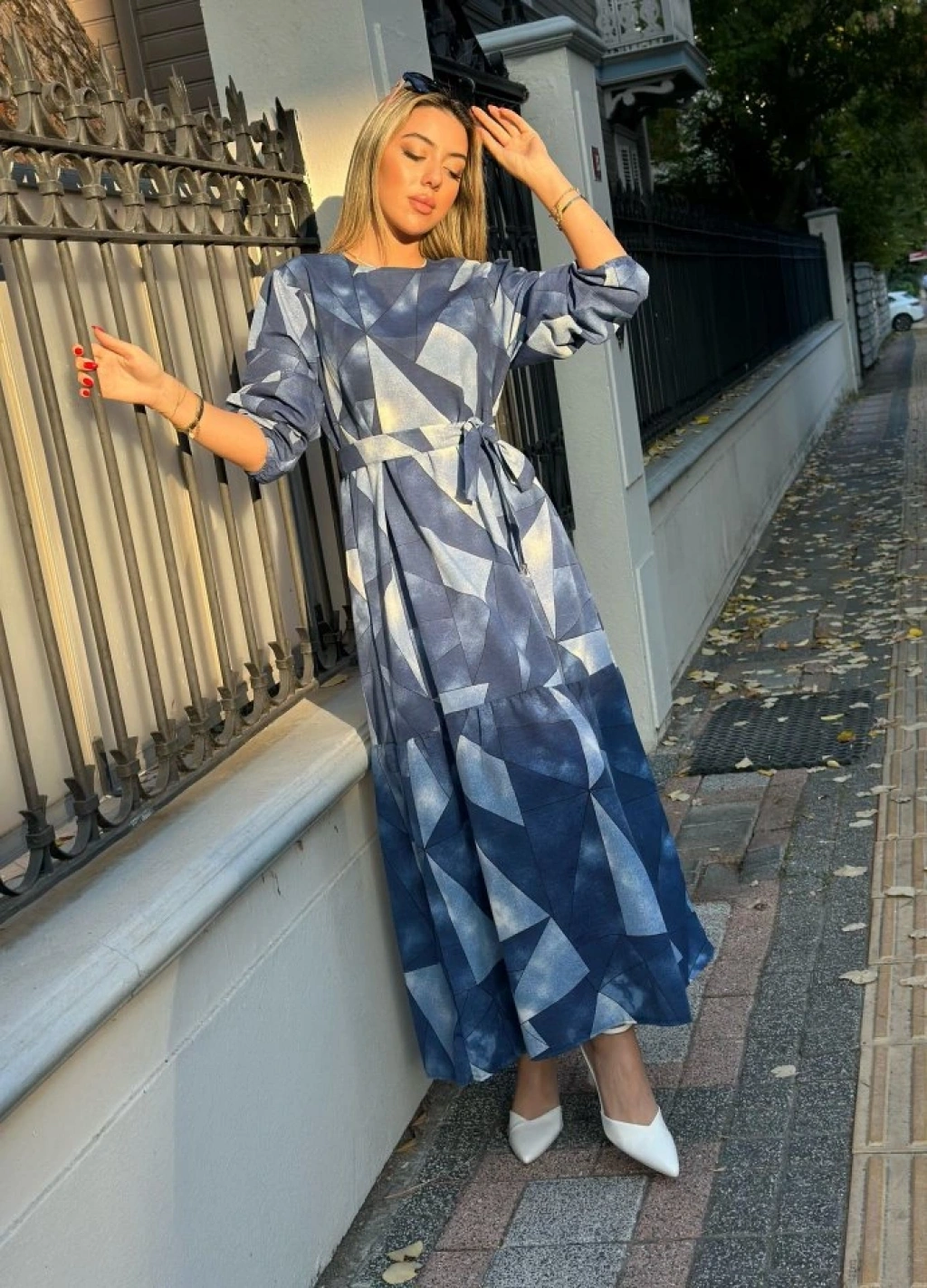 Kadın Uzun Kollu Bisiklet Yaka Geometrik Desen Baskılı Kuşak Dahil Maxi Boy Elbise