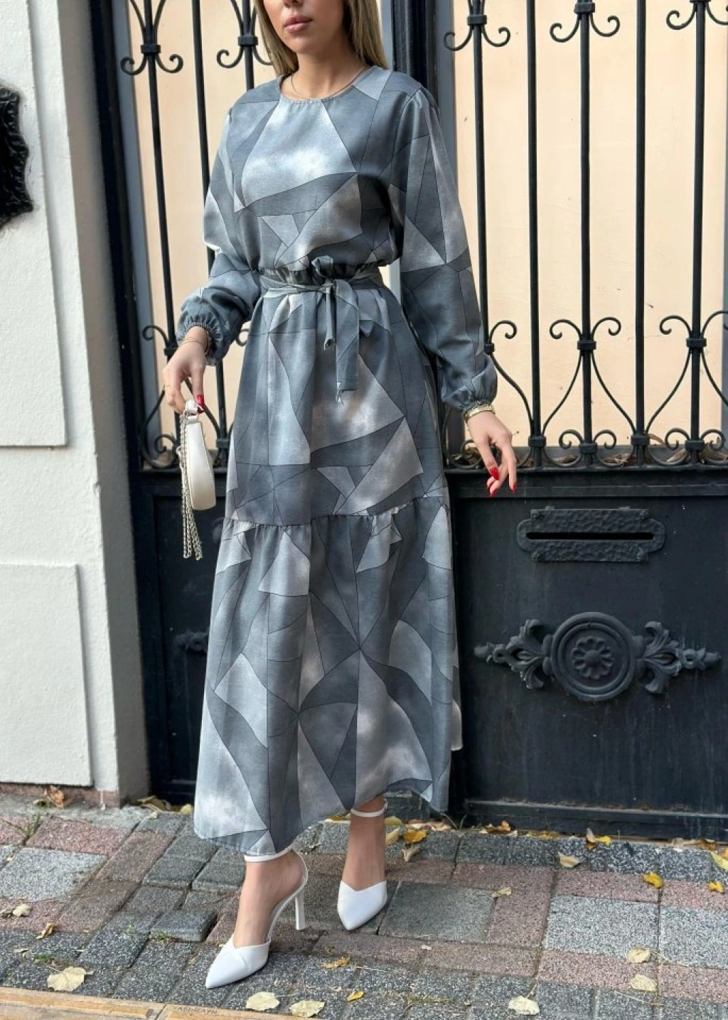 Kadın Uzun Kollu Bisiklet Yaka Geometrik Desen Baskılı Kuşak Dahil Maxi Boy Elbise