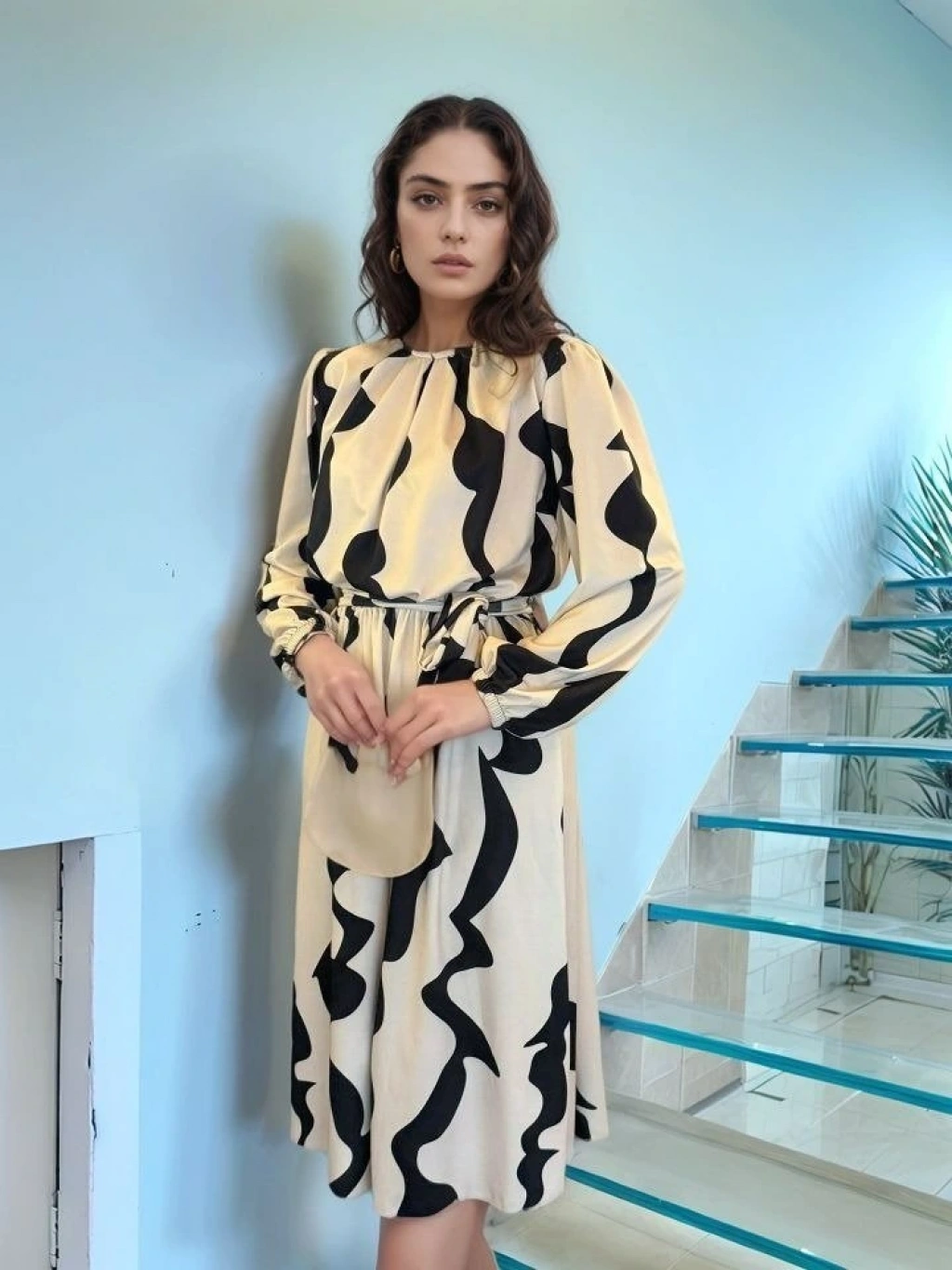 Kadın Uzun Kollu Bisiklet Yaka Geometrik Desenli Midi Dalgıç Elbise