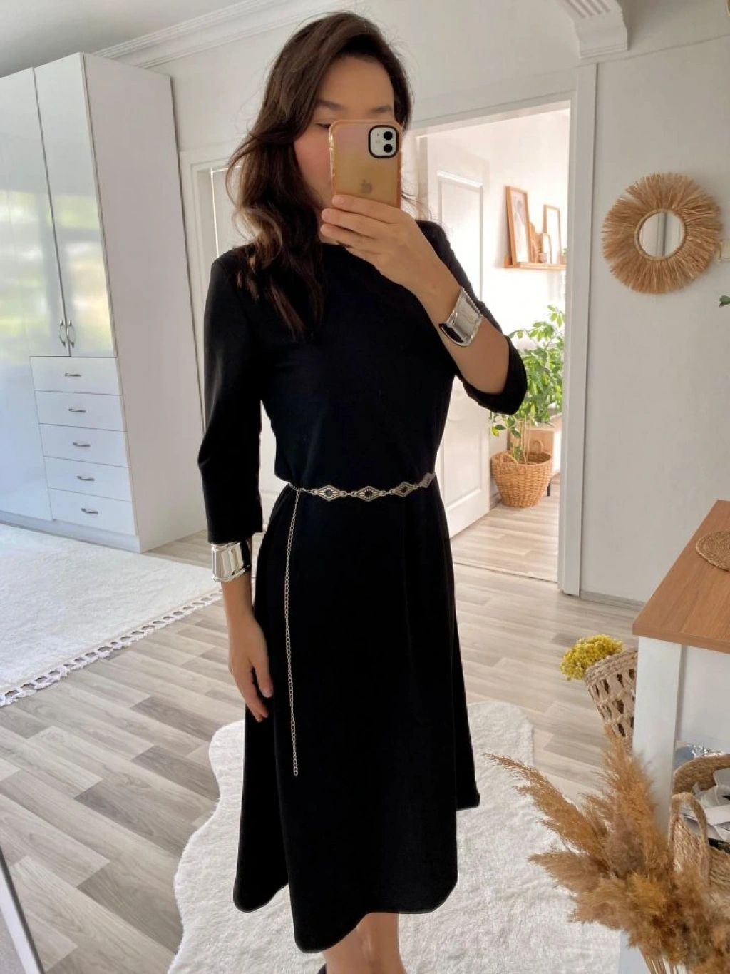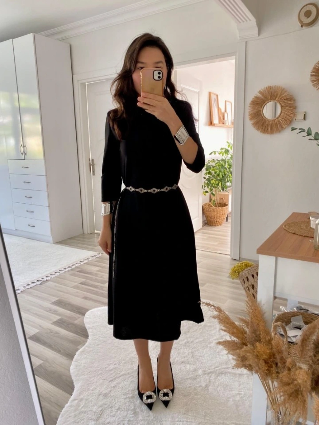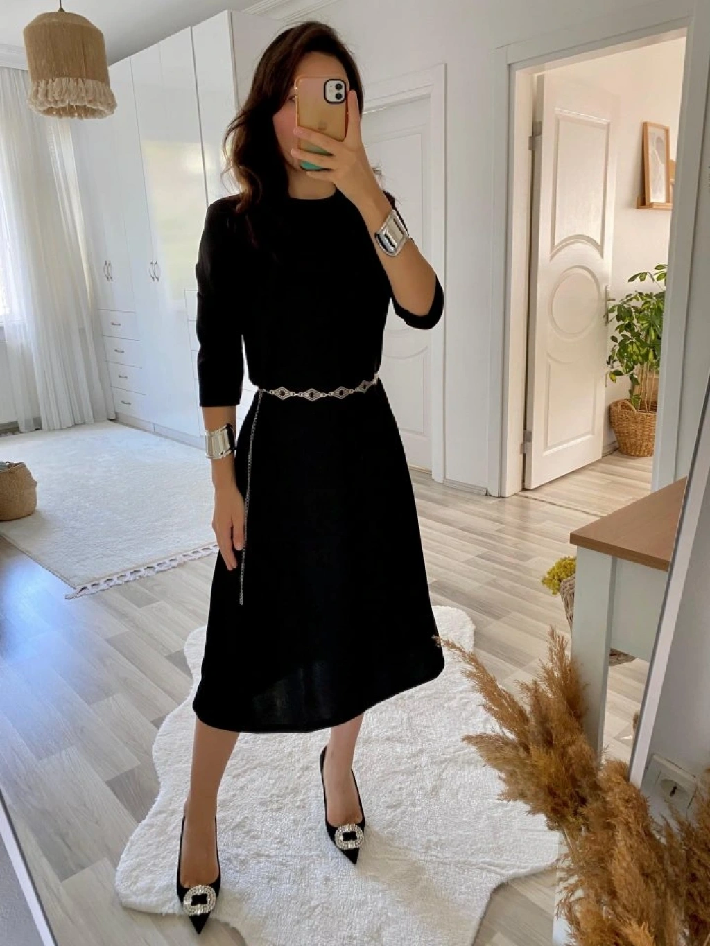 Kadın Uzun Kollu Bisiklet Yaka Midi Ithal Krep Elbise