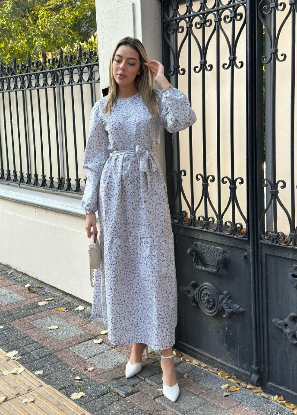 Kadın Uzun Kollu Bisiklet Yaka Papatya Desen Kuşak Dahil Maxi Boy Elbise