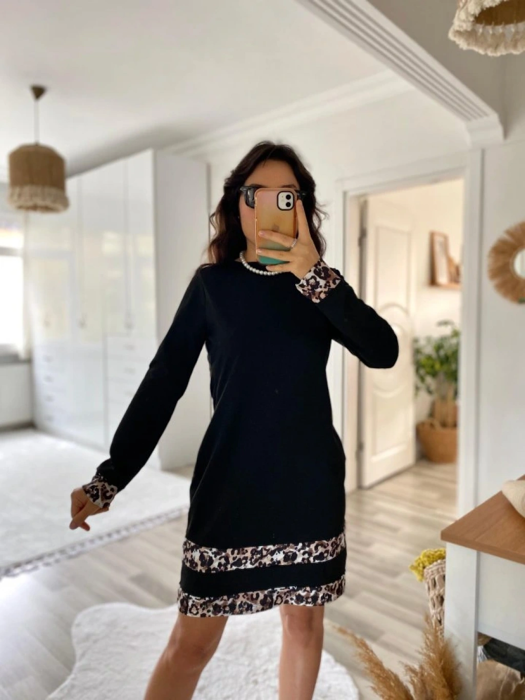 Kadın Uzun Kollu Bisiklet Yaka şerit Leopar Desenli Dalgıç Elbise