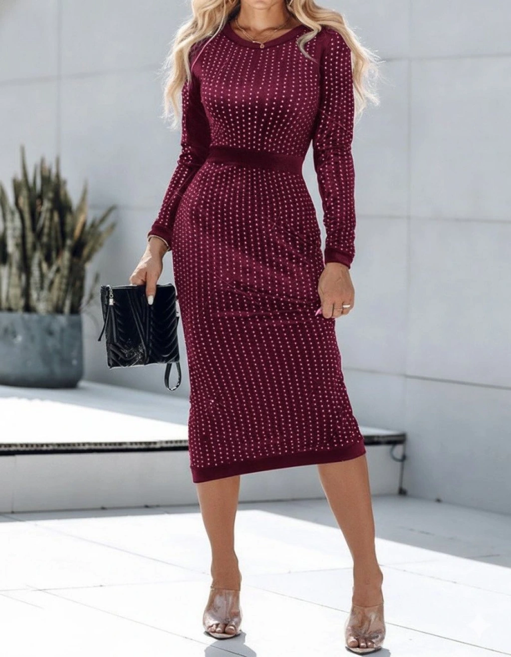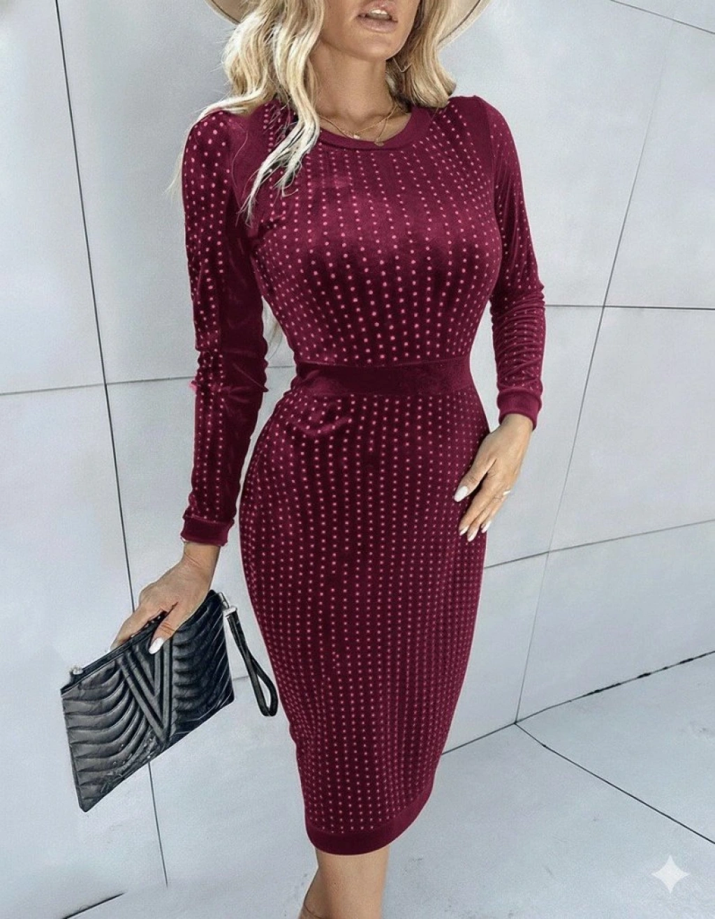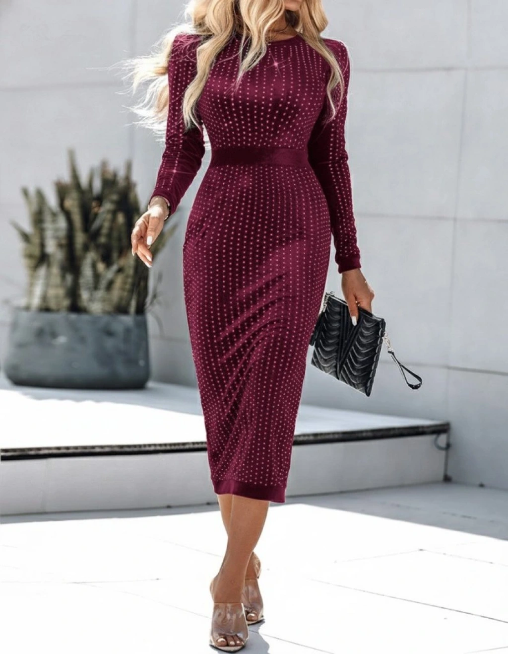 Kadın Uzun Kollu Bisiklet Yaka Taşlı Midi Kadife Elbise