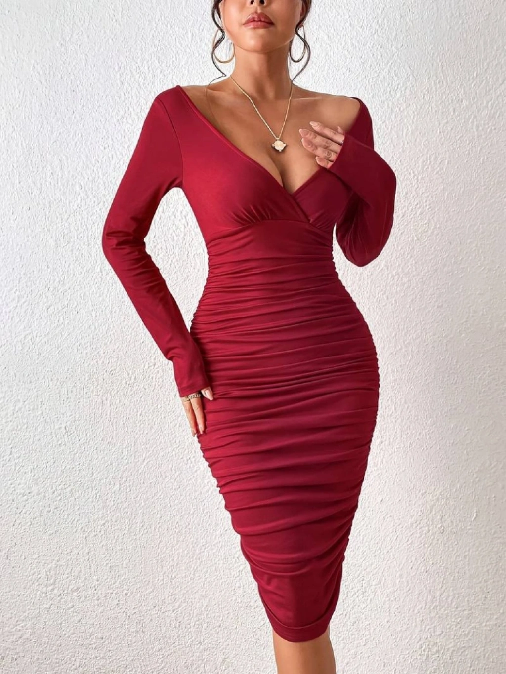 Kadın Uzun Kollu Derin Kruvaze Yakalı Büzgülü Sandy Midi Elbise