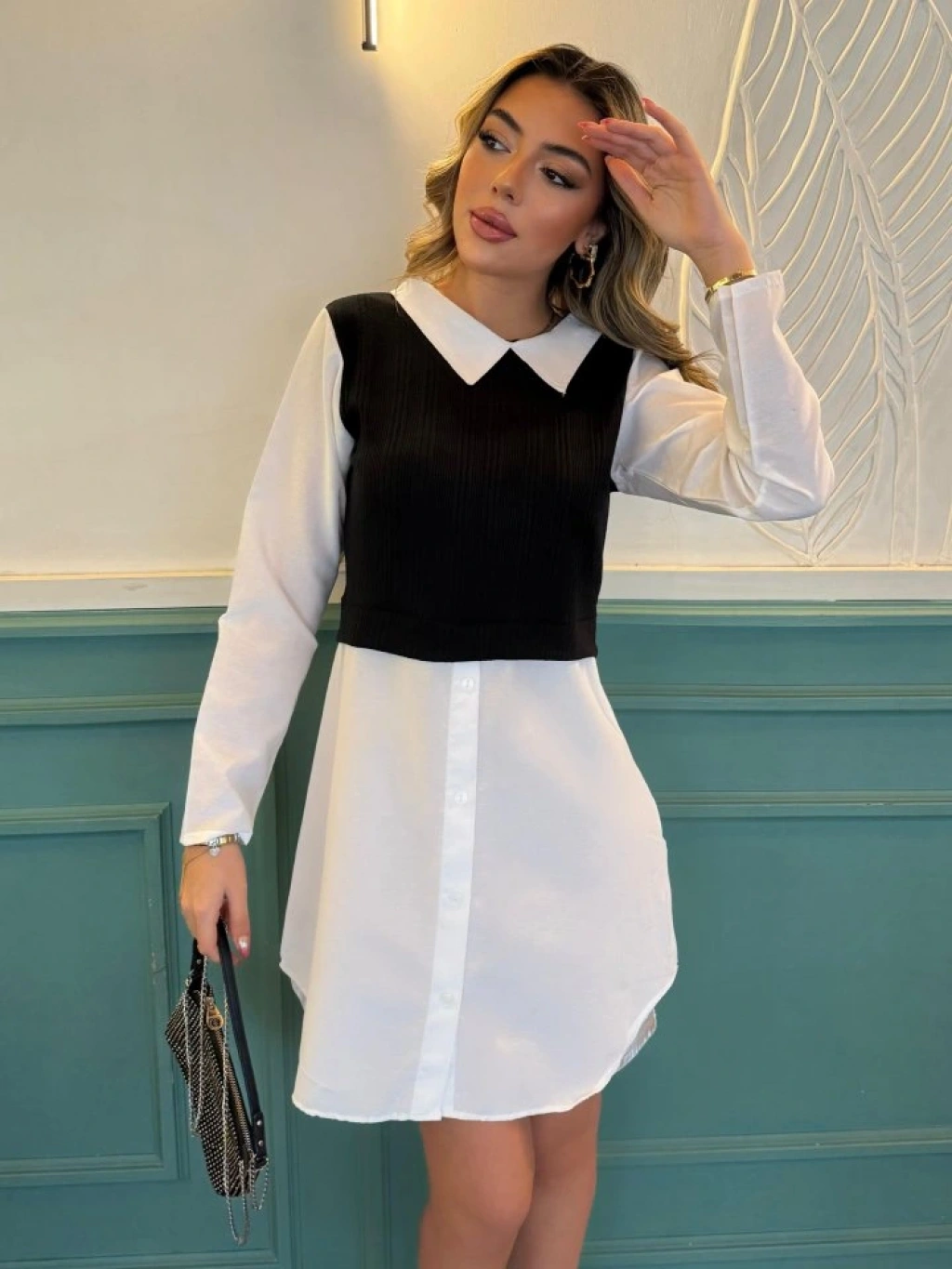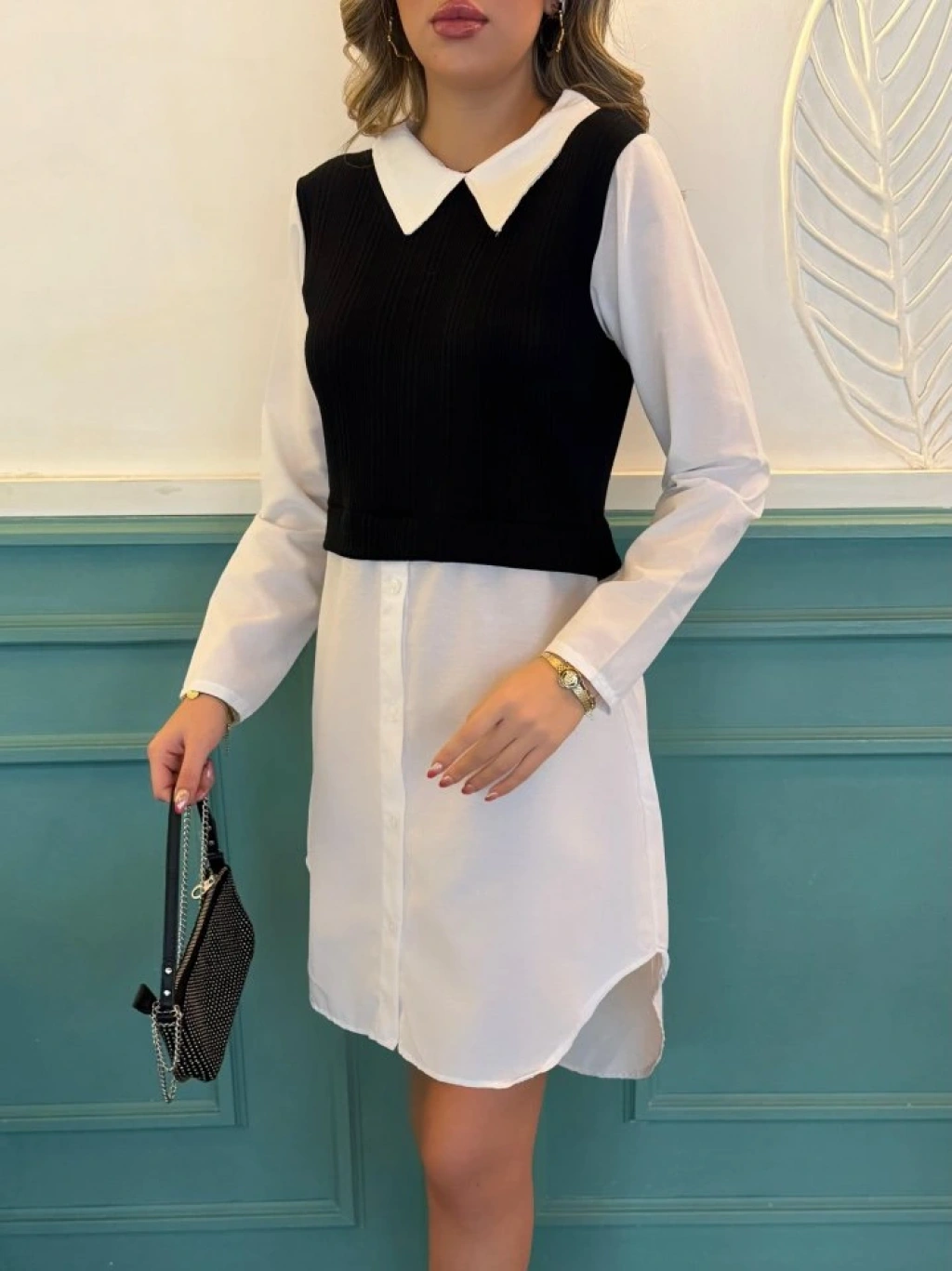 Kadın Uzun Kollu Gömlek Yaka çift Renkli Trikoton Elbise