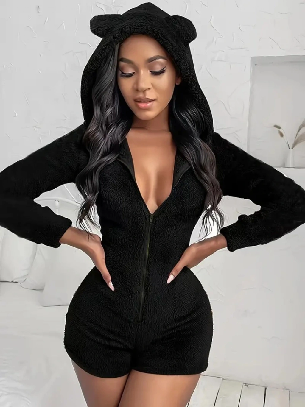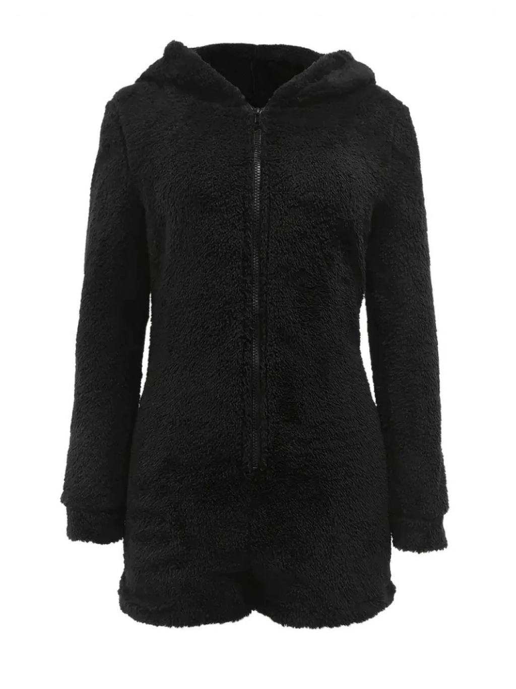 Kadın Uzun Kollu Kapişon Ve Fermuar Detaylı Peluş şort Tulum