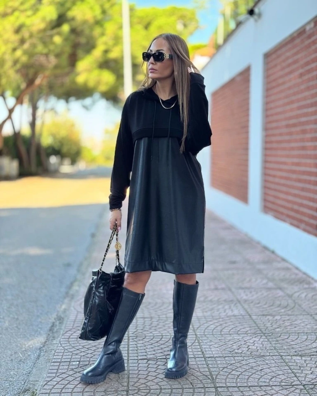 Kadın Uzun Kollu Kapüşon Ve Deri Detay Diz üstü Elbise
