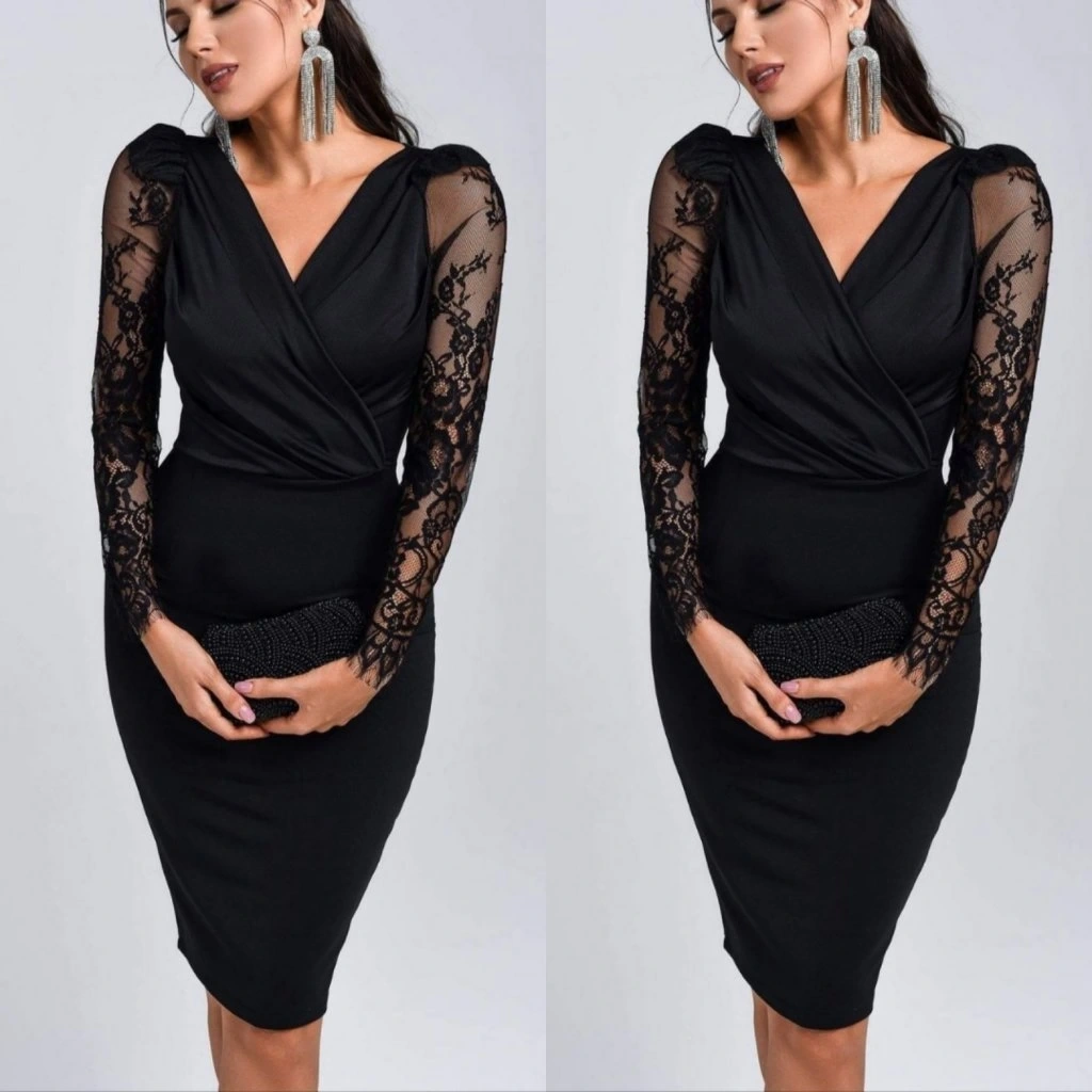 Kadın Uzun Kollu Kruvaze Yaka Kollar Tül Detay Krep Mini Boy Elbise