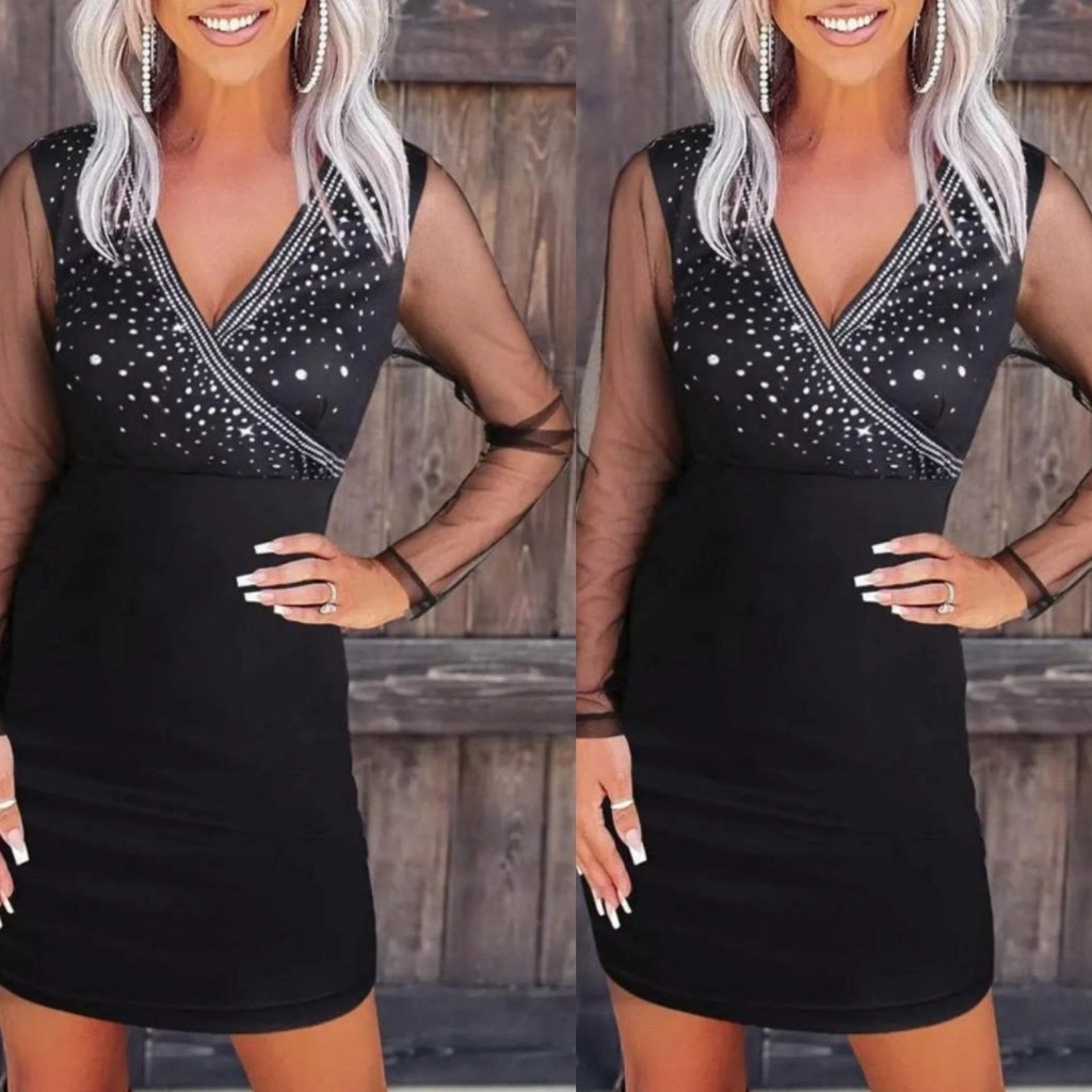 Kadın Uzun Kollu Kruvaze Yaka üst Kısım Taşlı Detay Krep Mini Boy Elbise