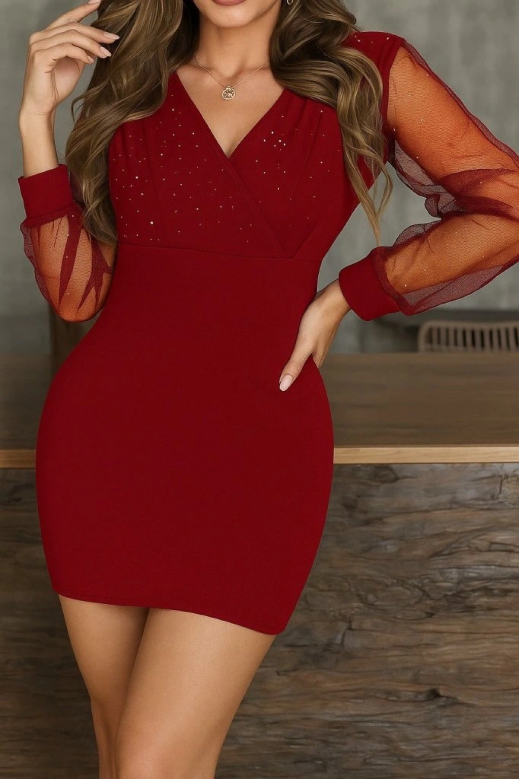 Kadın Uzun Kollu Kruvaze Yakalı Taşlı Mini Ithal Krep Elbise