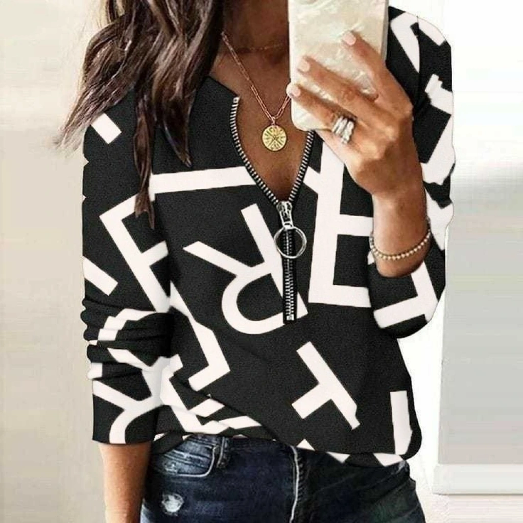 Kadın Uzun Kollu önden Fermuarlı Harf Baskılı şardonlu Dalgıç Bluz