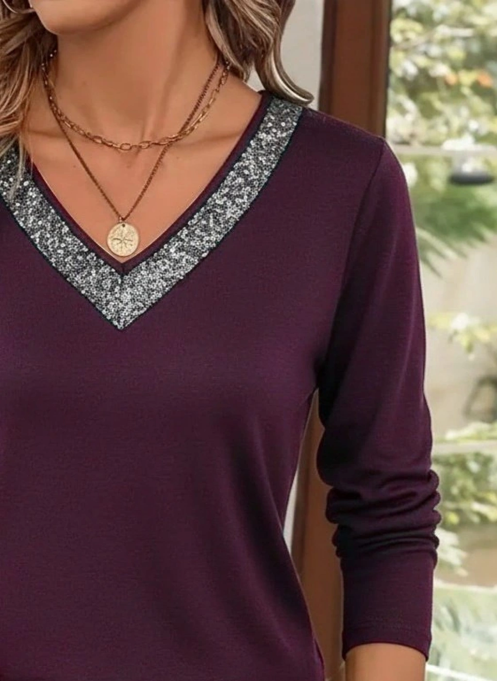 Kadın Uzun Kollu V Payet Yakalı Viskon Mürdüm Bluz