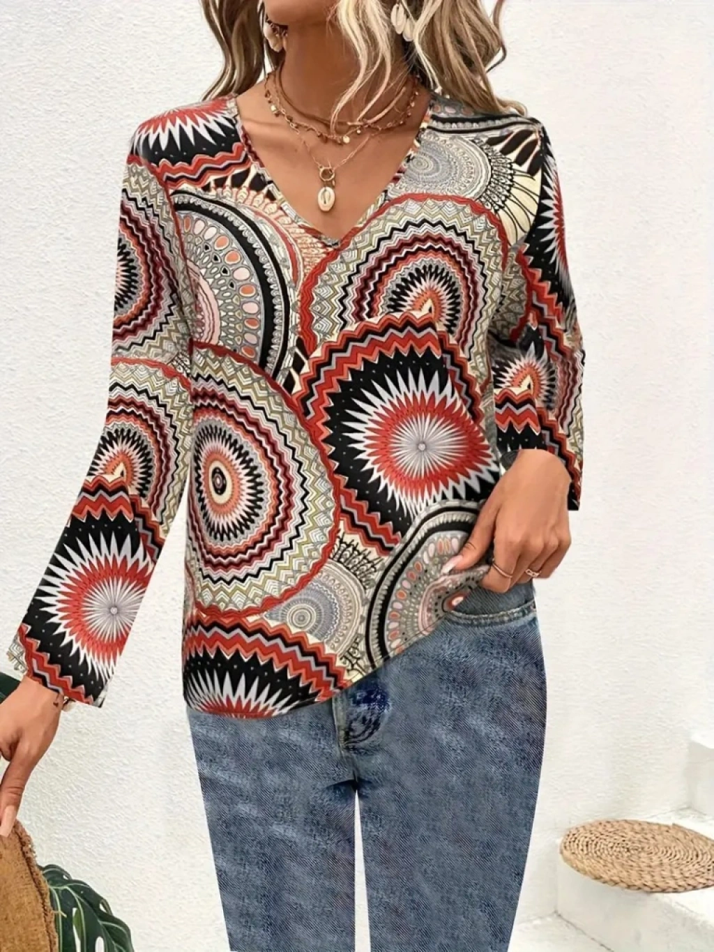 Kadın Uzun Kollu V Yakalı Desenli Süprem Bluz