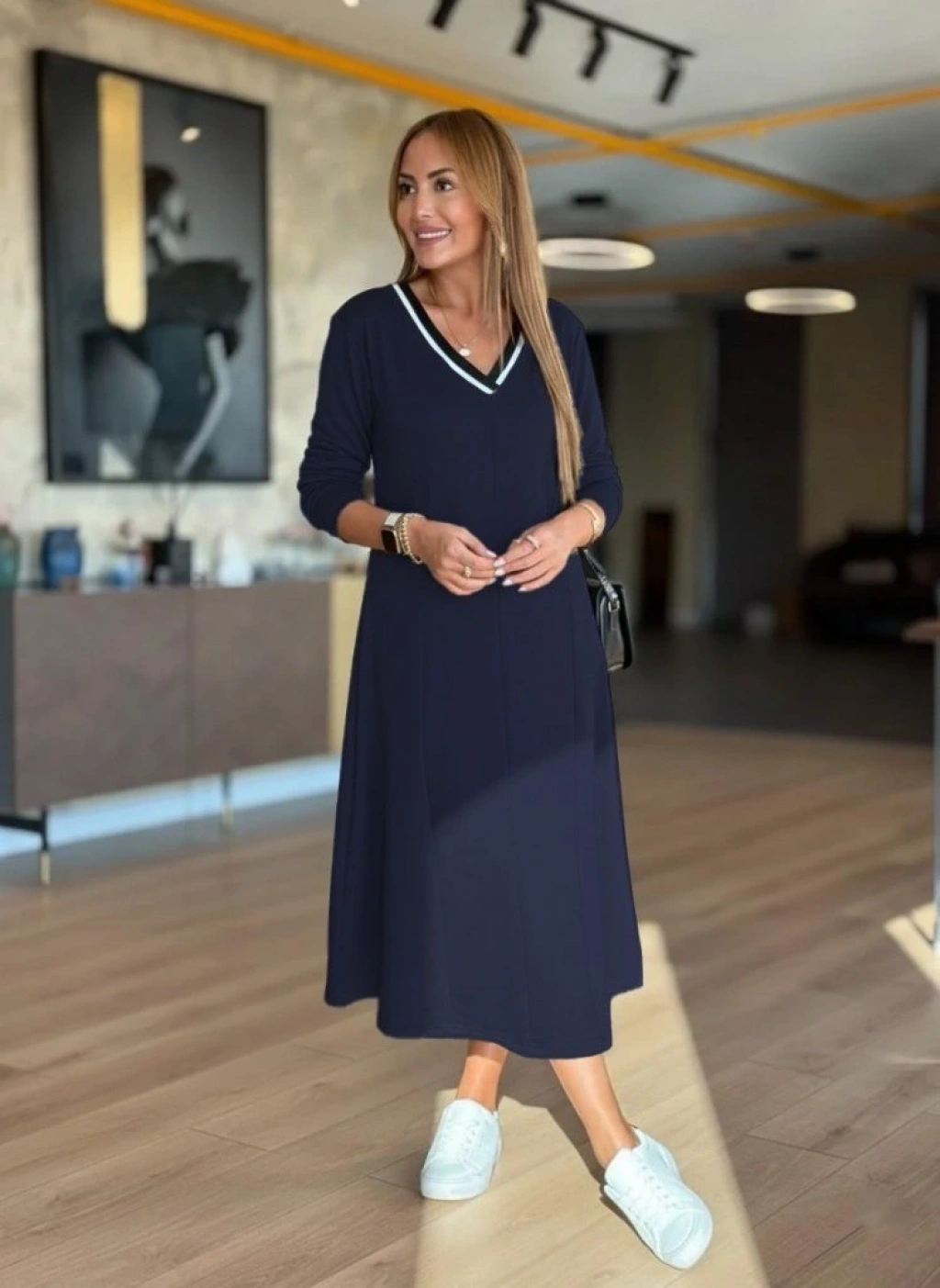 Kadın Uzun Kollu V Yakalı Midi Modal Elbise