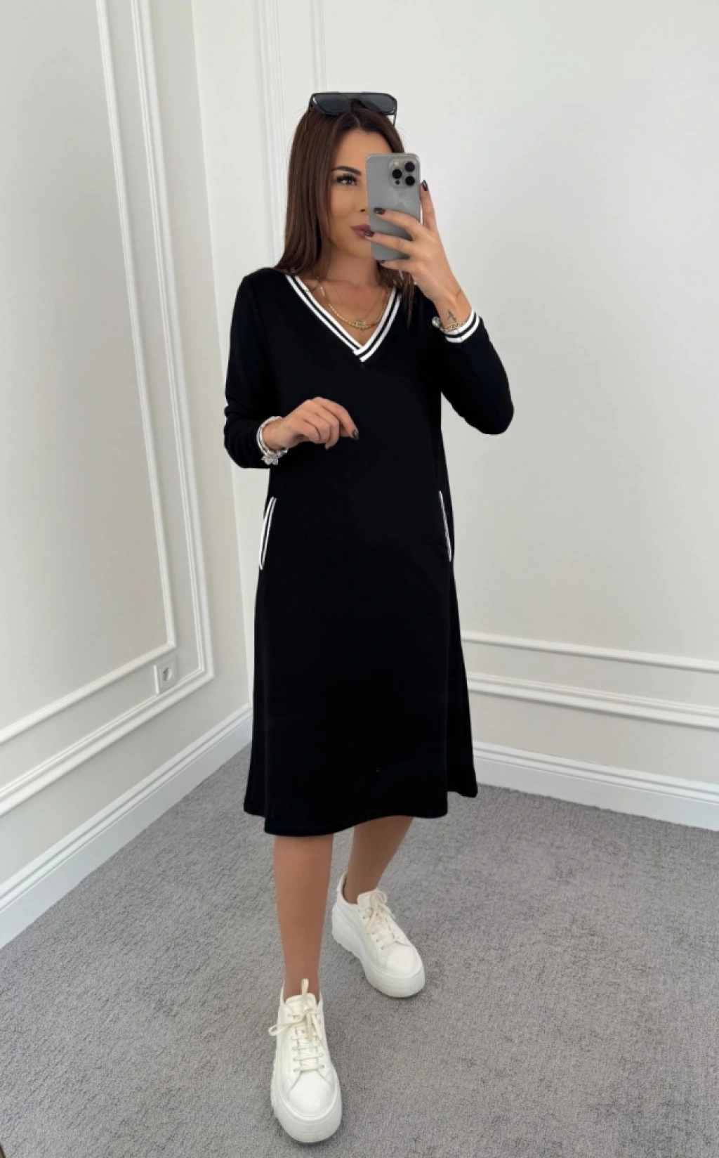 Kadın Uzun Kollu V Yakalı şerit Detaylı Cepli Midi Viskon Iki Iplik Elbise