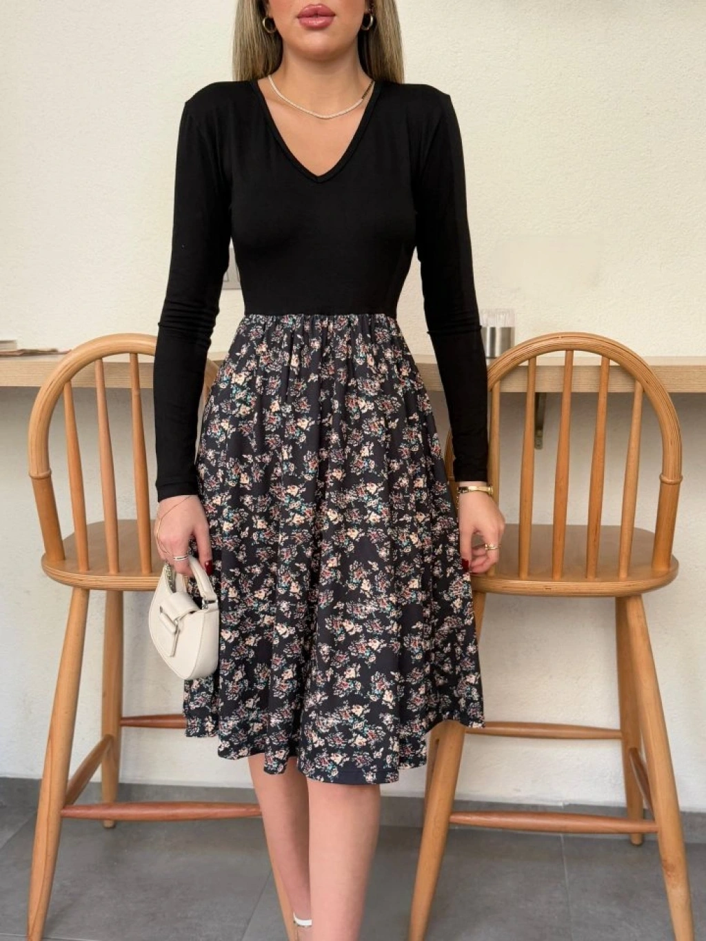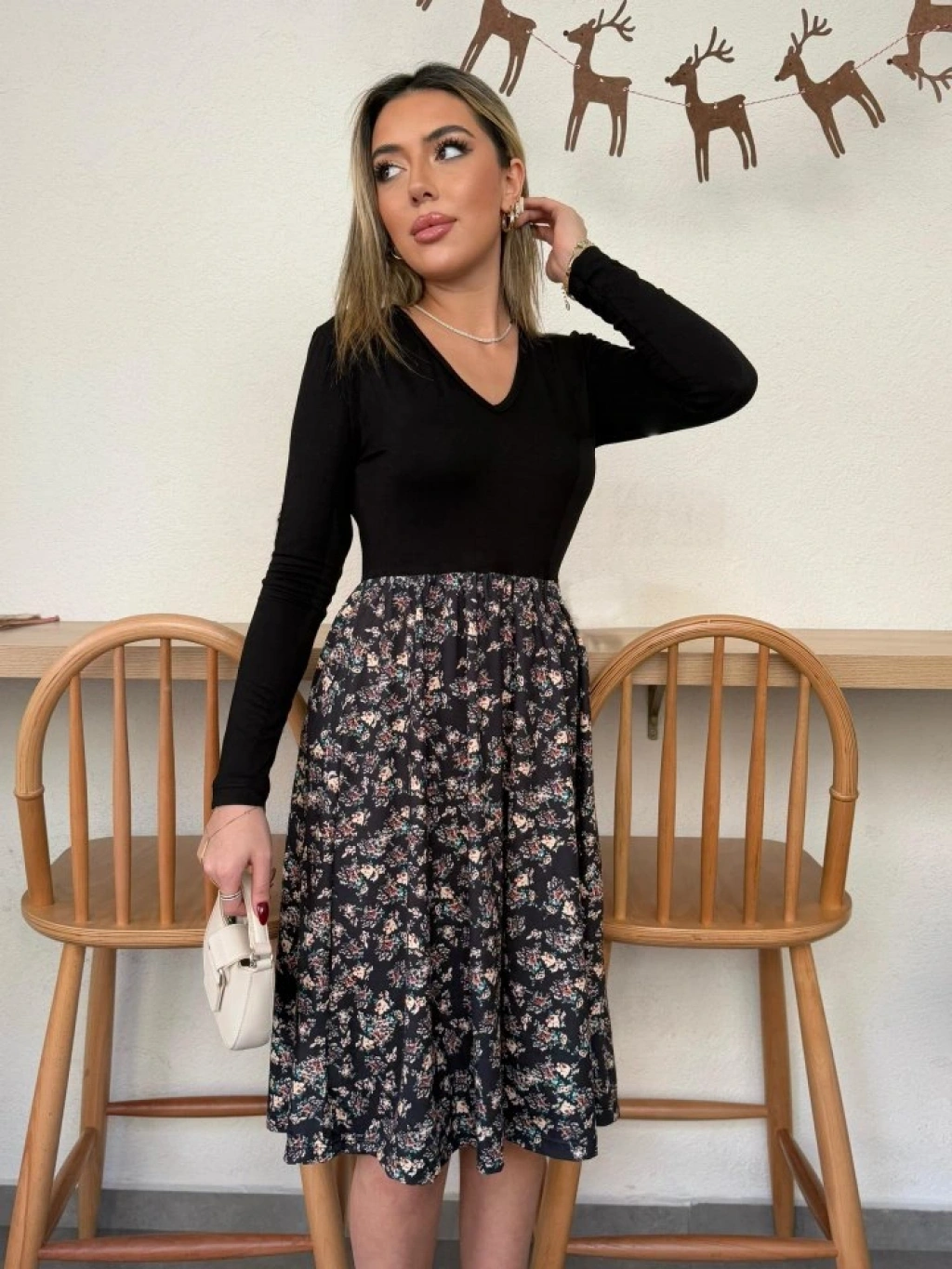 Kadın Uzun Kollu V Yakalı üst Viskon Alt çiçek Desenli Süprem Kısa Elbise