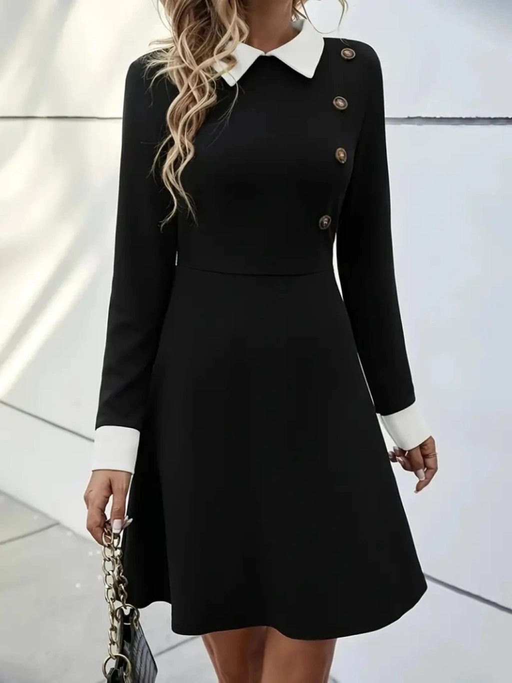 Kadın Uzun Kollu Yakalı A Kesim Kısa Ithal Krep Elbise