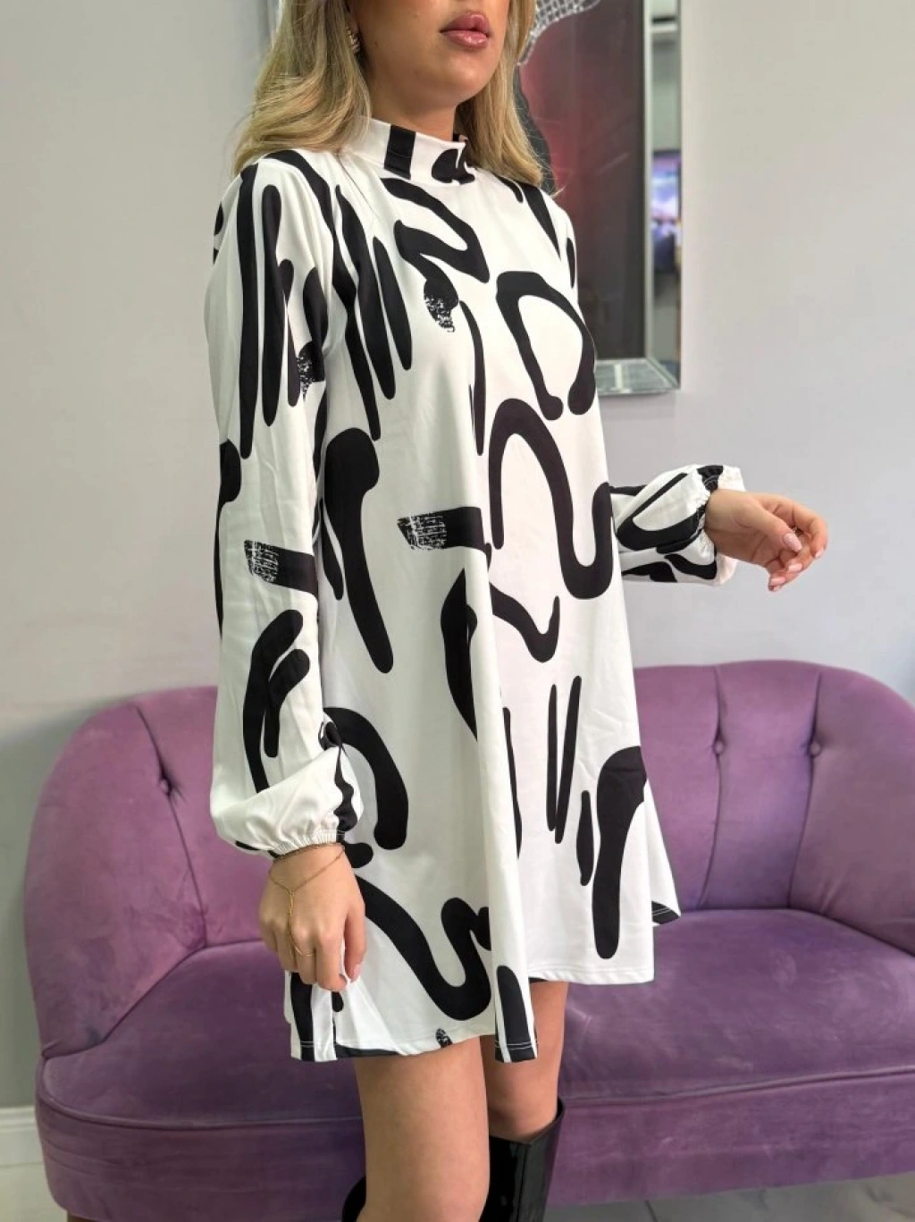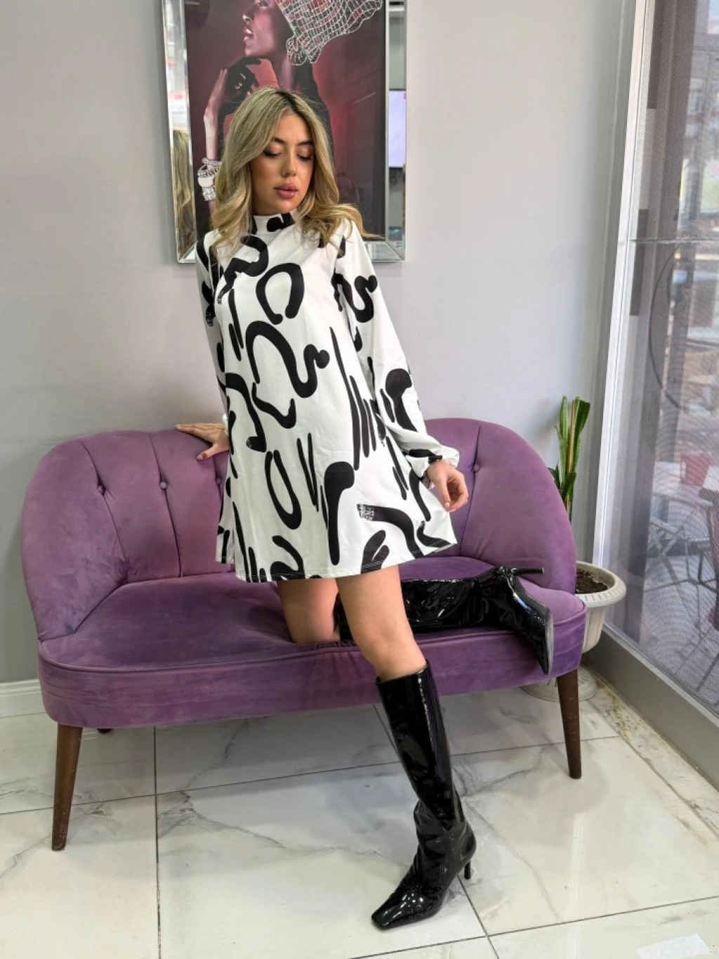 Kadın Uzun Kollu Yarı Balıkçı Yaka Desenli Kısa Dalgıç Elbise