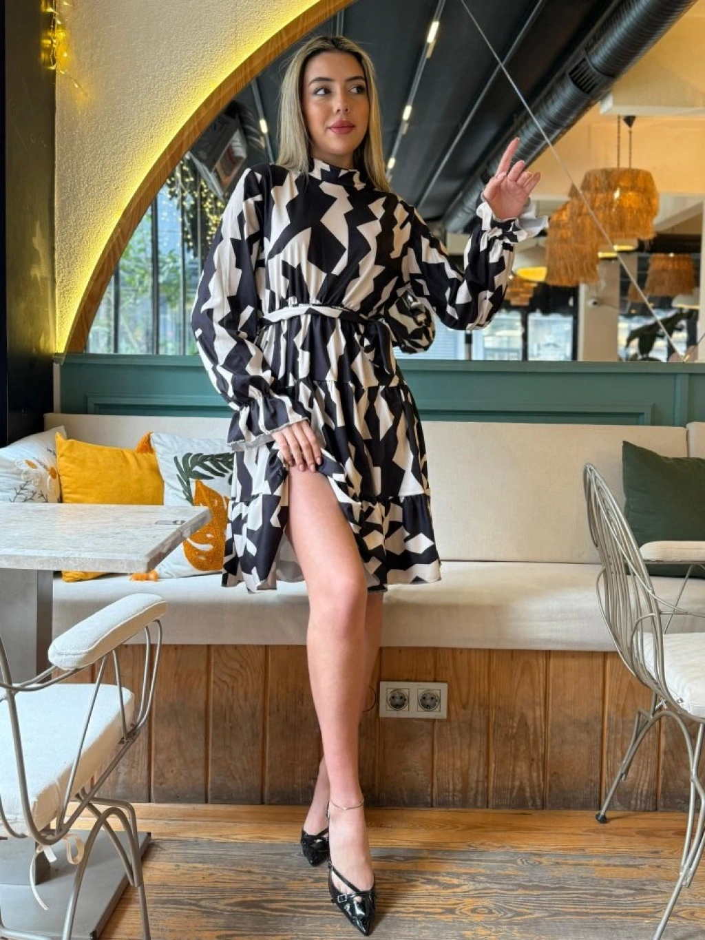 Kadın Uzun Kollu Yarı Balıkçı Yaka Geometrik Desen Kısa şardonlu Dalgıç Elbise