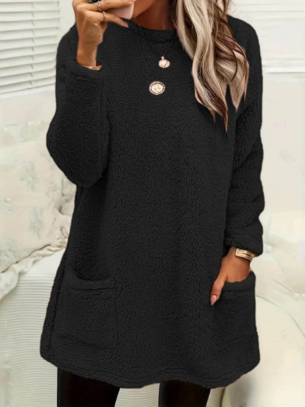 Kadın Uzun Kollu Yuvarlak Yakalı Cepli Peluş Bluz